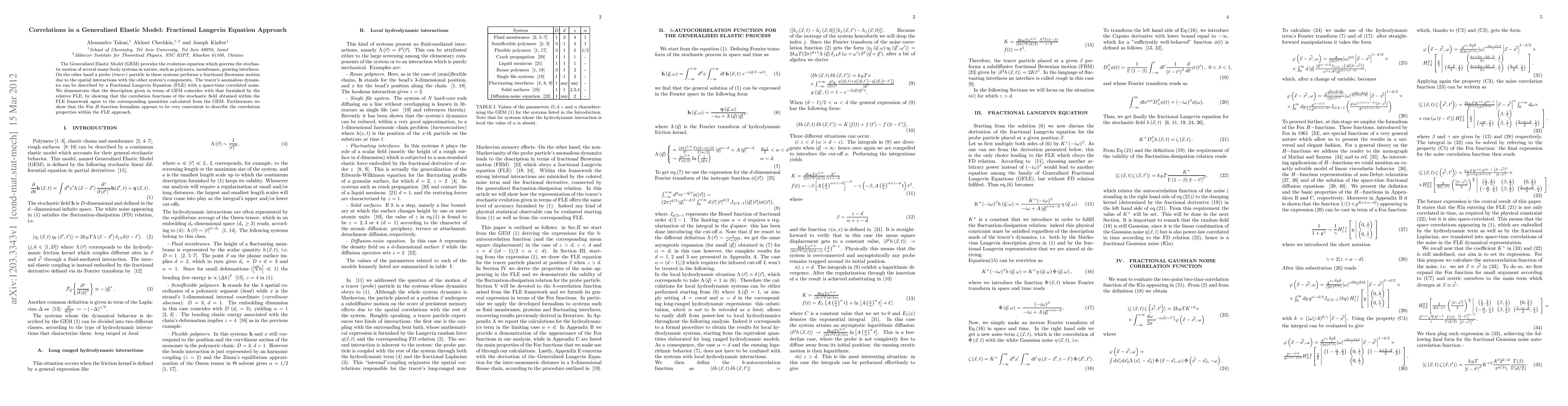 This paper investigates the Generalized Elastic Model (GEM) and demonstrates its equivalence to the Fractional Langevin Equation (FLE) for describing the anomalous dynamics of tracer particles in many-body systems. It shows that correlation functions derived from both models match, using the Fox $H$-function formalism to effectively describe the correlation properties within the FLE framework.