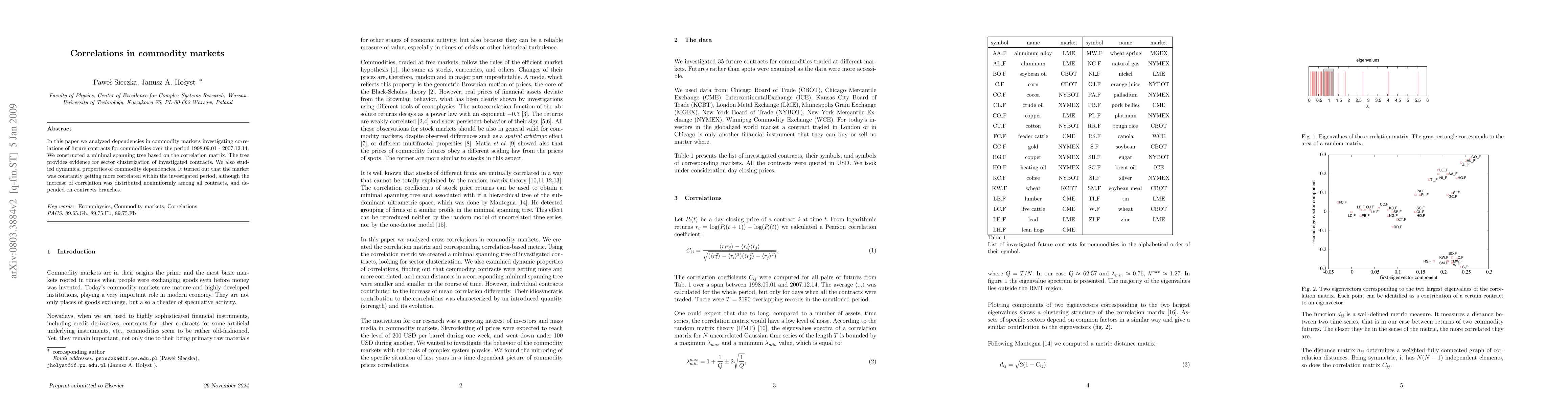 In this paper we analyzed dependencies in commodity markets investigating correlations of future contracts for commodities over the period 1998.09.01 - 2007.12.14. We constructed a minimal spanning tree based on the correlation matrix. The tree provides evidence for sector clusterization of investigated contracts. We also studied dynamical properties of commodity dependencies. It turned out that the market was constantly getting more correlated within the investigated period, although the increase of correlation was distributed nonuniformly among all contracts, and depended on contracts branches.