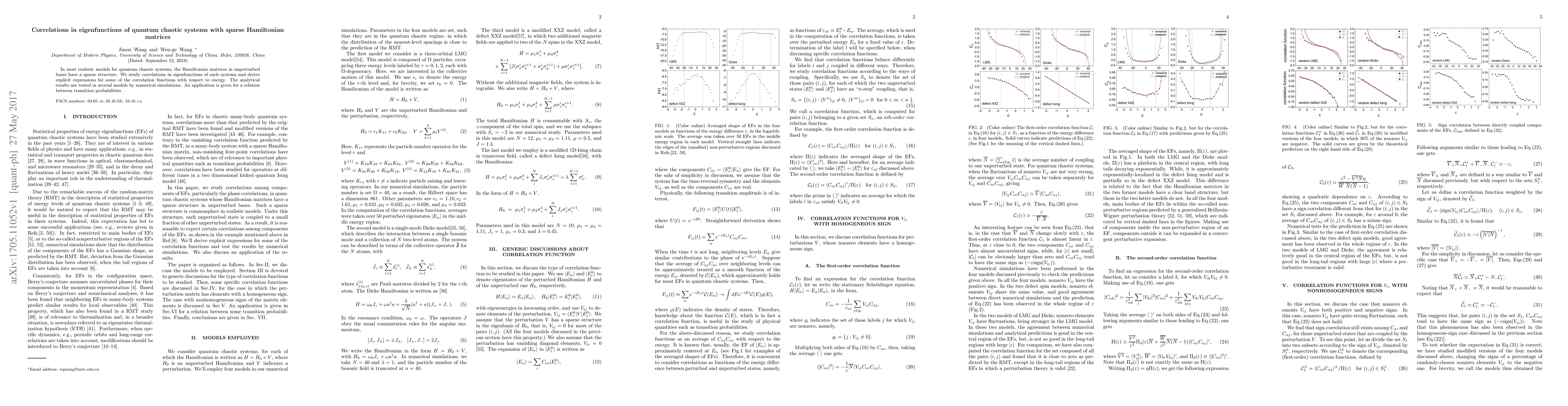 This paper investigates correlations in eigenfunctions of quantum chaotic systems with sparse Hamiltonian matrices, deriving explicit expressions for energy-related correlation functions and validating these results through numerical simulations, with an application to transition probabilities.