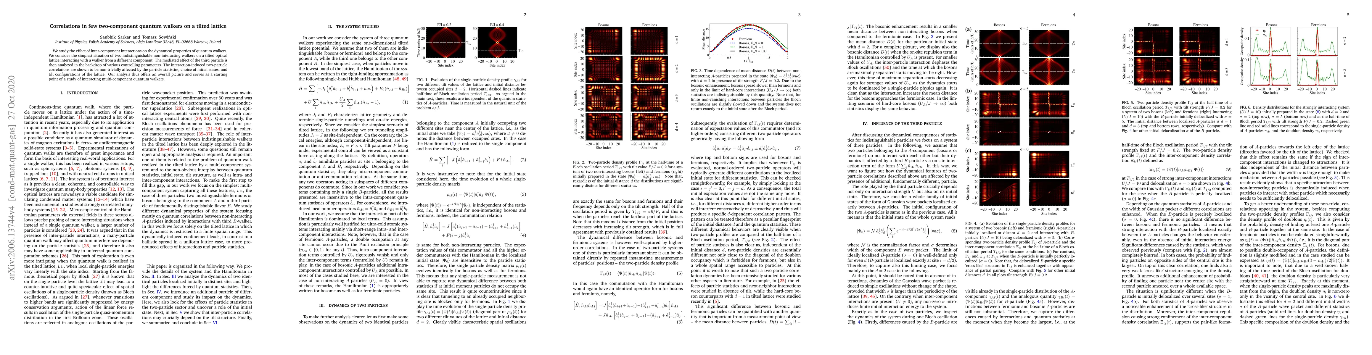 The paper presents a detailed analysis of correlations in few two-component quantum walkers on a tilted lattice, highlighting the influence of particle statistics, interactions, initial states, and lattice structure.