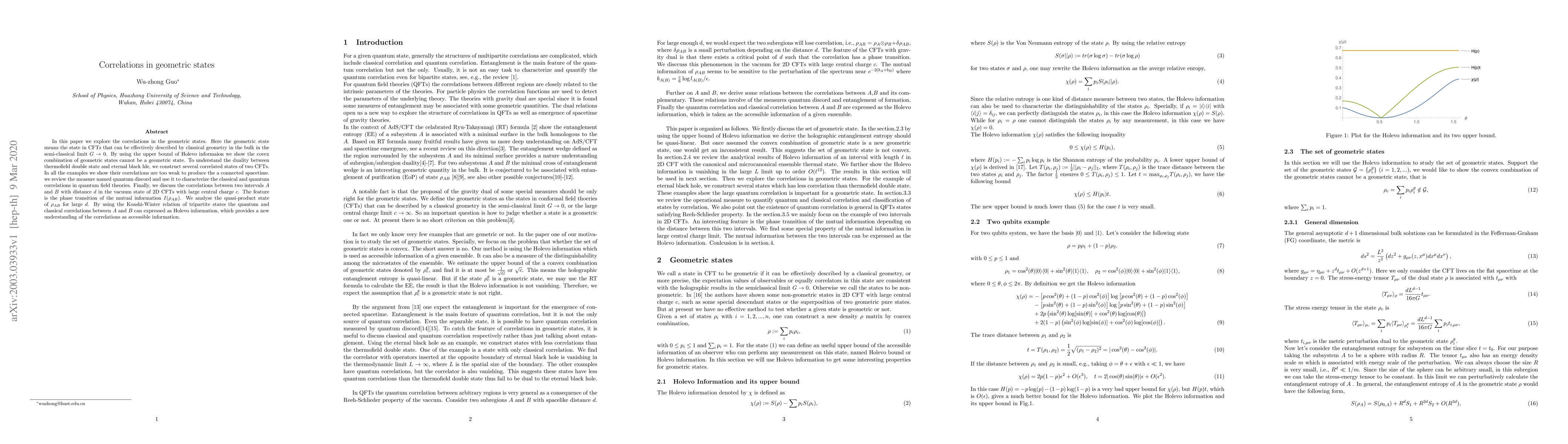 In this paper we explore the correlations in the geometric states. Here the geometric state means the state in CFTs that can be effectively described by classical geometry in the bulk in the semi-classical limit $G\to 0$. By using the upper bound of Holevo informaion we show the covex combination of geometric states cannot be a geometric state. To understand the duality between thermofield double state and eternal black hle, we construct several correlated states of two CFTs. In all the examples we show their correlations are too weak to produce the a connected spacetime. we review the measure named quantum discord and use it to characterize the classical and quantum correlations in quantum field theories. Finally, we discuss the correlations between two intervals $A$ and $B$ with distance $d$ in the vacuum state of 2D CFTs with large central charge $c$. The feature is the phase transition of the mutual information $I(\rho_{AB})$. We analyse the quasi-product state of $\rho_{AB}$ for large $d$. By using the Koashi-Winter relation of tripartite states the quantum and classical correlations between $A$ and $B$ can expressed as Holevo information, which provides a new understanding of the correlations as accessible information.