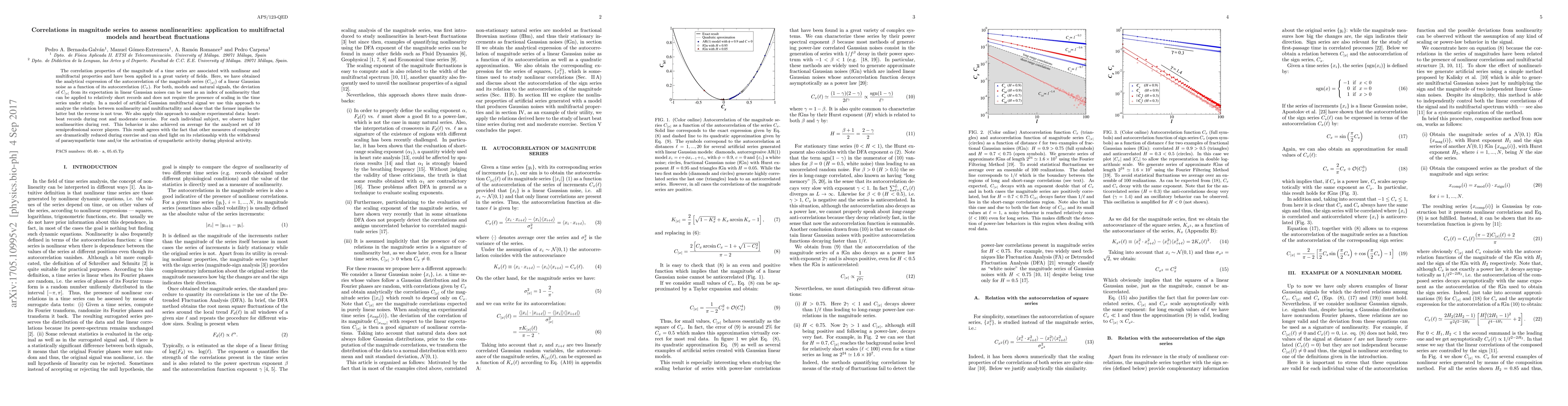 The correlation properties of the magnitudes of a time series (sometimes called volatility) are associated with nonlinear and multifractal properties and have been applied in a great variety of fields. Here, we have obtained analytically the expression of the autocorrelation of the magnitude series of a linear Gaussian noise as a function of its correlation as well as several analytical relations involving them. For both, models and natural signals, the deviation from these equations can be used as an index of non-linearity that can be applied to relatively short records and that does not require the presence of scaling in the time series under study. We apply this approach to show that the heart-beat records during rest show higher non-linearities than the records of the same subject during moderate exercise. This behavior is also achieved on average for the analyzed set of 10 semiprofessional soccer players. This result agrees with the fact that other measures of complexity are dramatically reduced during exercise and can shed light on its relationship with the withdrawal of parasympathetic tone and/or the activation of sympathetic activity during physical activity.