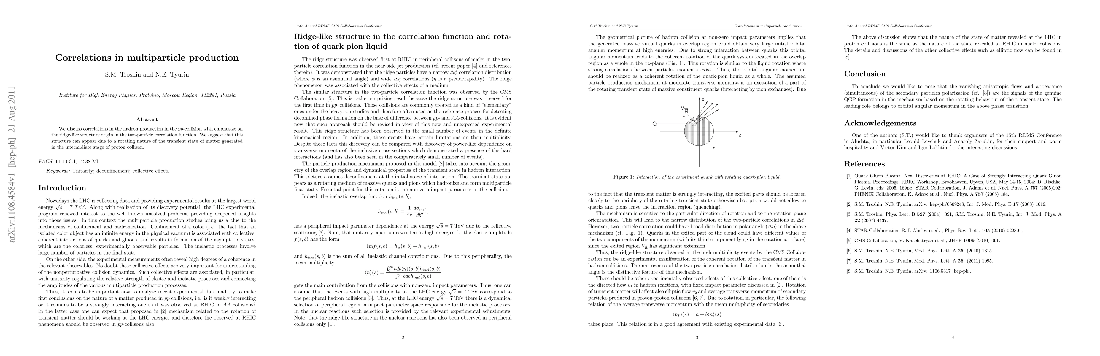 We discuss correlations in the hadron production in the $pp$-collision with emphasize on the ridge-like structure origin in the two-particle correlation function. We suggest that this structure can appear due to a rotating nature of the transient state of matter generated in the intermidiate stage of proton collison.