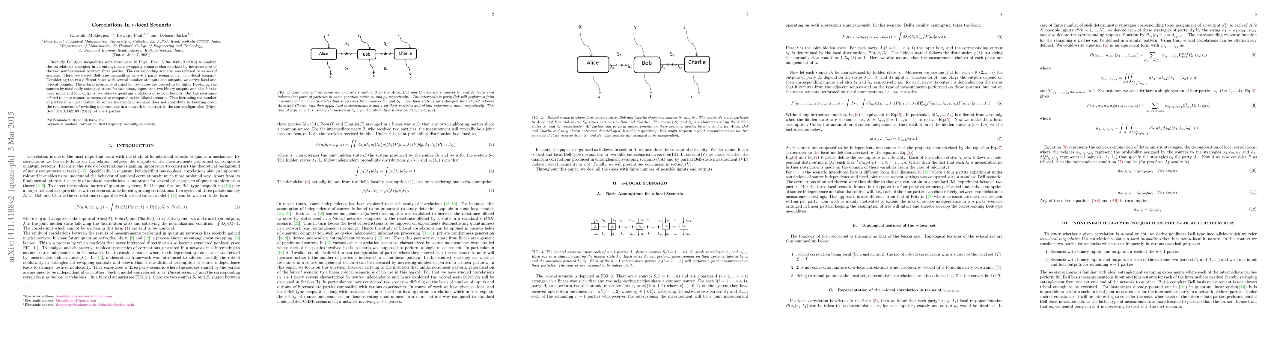 Researchers derived Bell-type inequalities for n-local scenarios to study correlations in entanglement swapping with increasing numbers of parties. They found that increasing the number of parties did not contribute to lowering the requirements of revealing quantumness in a network.