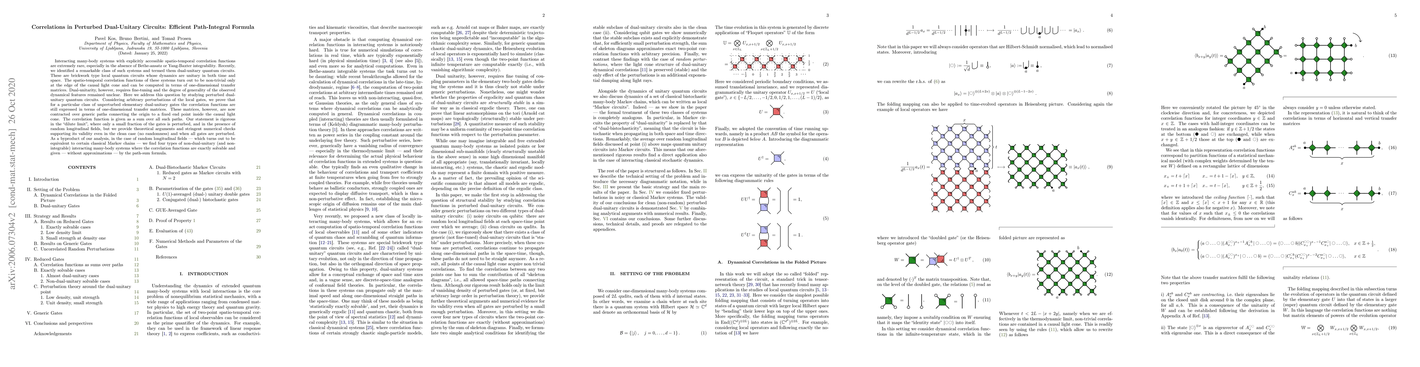 Interacting many-body systems with explicitly accessible spatio-temporal correlation functions are extremely rare, especially in the absence of integrability. Recently, we identified a remarkable class of such systems and termed them dual-unitary quantum circuits. These are brick-wall type local quantum circuits whose dynamics are unitary in both time and space. For these systems the spatio-temporal correlation functions are non-trivial only at the edge of the causal light cone and can be computed in terms of one-dimensional transfer matrices. Dual-unitarity, however, requires fine-tuning and the degree of generality of the observed dynamical features remained unclear. Here we address this question by introducing arbitrary perturbations of the local gates. Considering fixed perturbations, we prove that for a particular class of unperturbed elementary dual-unitary gates the correlation functions are still expressed in terms of one-dimensional transfer matrices. These matrices, however, are now contracted over generic paths connecting the origin to a fixed endpoint inside the causal light cone. The correlation function is given as a sum over all such paths. Our statement is rigorous in the "dilute limit", where only a small fraction of the gates is perturbed, and in the presence of random longitudinal fields, but we provide theoretical arguments and stringent numerical checks supporting its validity even in the clean case and when all gates are perturbed. As a byproduct, in the case of random longitudinal fields -- which turns out to be equivalent to certain classical Markov chains -- we find four types of non-dual-unitary(and non-integrable) interacting many-body systems where the correlation functions are exactly given by the path-sum formula.