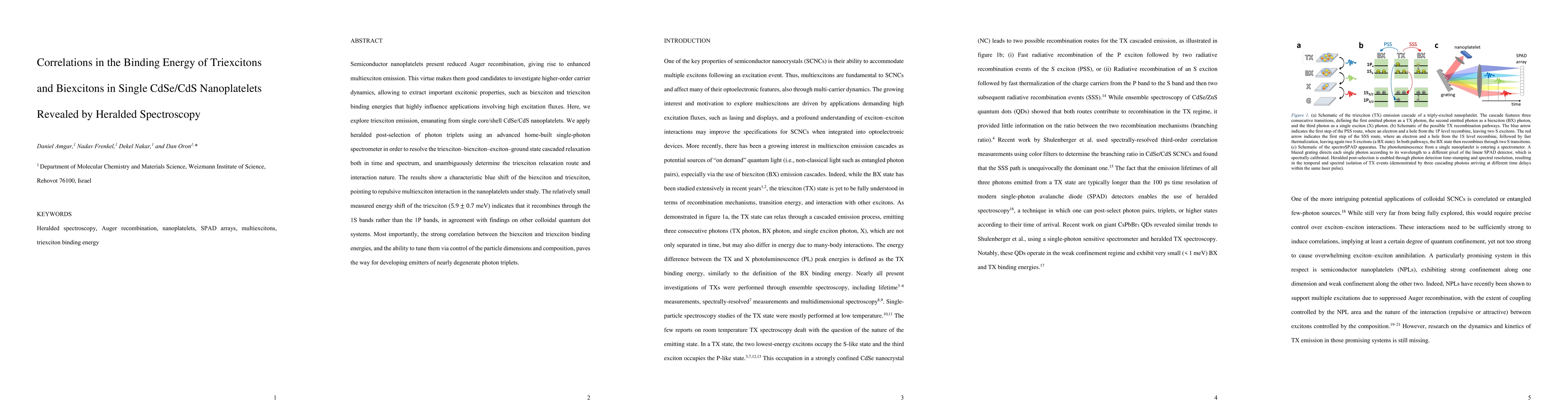 Semiconductor nanoplatelets present reduced Auger recombination, giving rise to enhanced multiexciton emission. This virtue makes them good candidates to investigate higher-order carrier dynamics, allowing to extract important excitonic properties, such as biexciton and triexciton binding energies that highly influence applications involving high excitation fluxes. Here, we explore triexciton emission, emanating from single core/shell CdSe/CdS nanoplatelets. We apply heralded post-selection of photon triplets using an advanced home-built single-photon spectrometer in order to resolve the triexciton$-$biexciton$-$exciton$-$ground state cascaded relaxation both in time and spectrum, and unambiguously determine the triexciton relaxation route and interaction nature. The results show a characteristic blue shift of the biexciton and triexciton, pointing to repulsive multiexciton interaction in the nanoplatelets under study. The relatively small measured energy shift of the triexciton (5.9 $\pm$ 0.7 meV) indicates that it recombines through the 1S bands rather than the 1P bands, in agreement with findings on other colloidal quantum dot systems. Most importantly, the strong correlation between the biexciton and triexciton binding energies, and the ability to tune them via control of the particle dimensions and composition, paves the way for developing emitters of nearly degenerate photon triplets.
