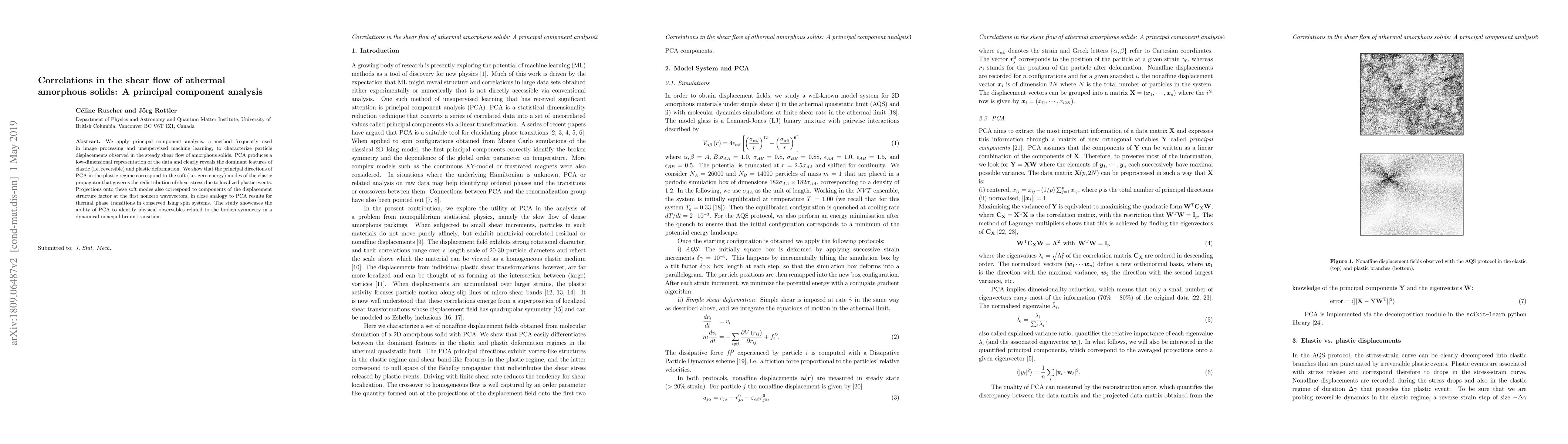 This paper uses principal component analysis (PCA) to analyze particle displacements in the shear flow of amorphous solids, revealing dominant features of elastic and plastic deformation. PCA identifies plastic deformation directions corresponding to zero energy modes, highlighting PCA's effectiveness in uncovering broken symmetry in nonequilibrium dynamics.
