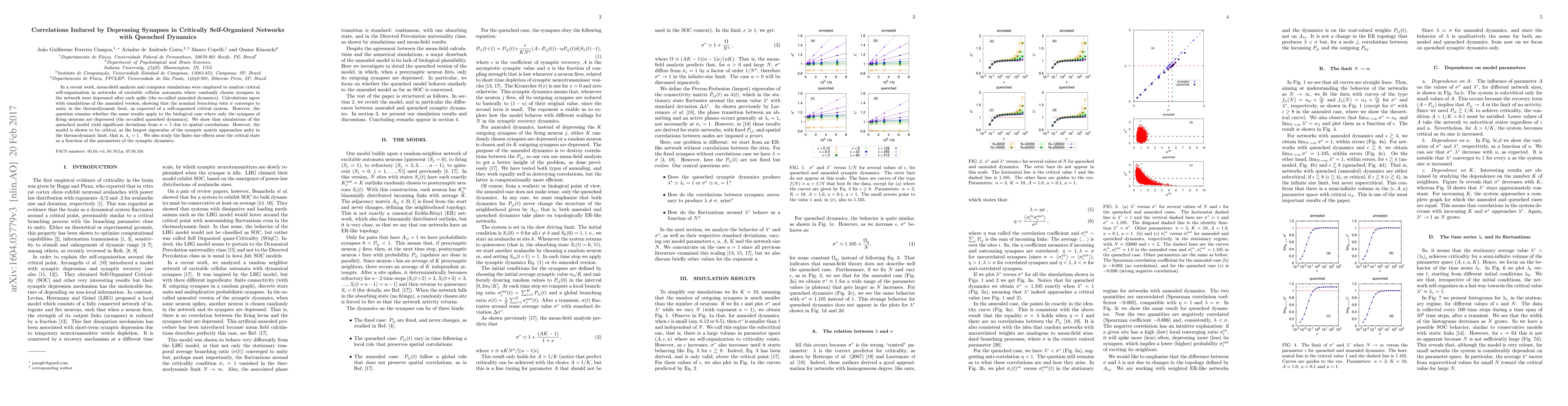 In a recent work, mean-field analysis and computer simulations were employed to analyze critical self-organization in networks of excitable cellular automata where randomly chosen synapses in the network were depressed after each spike (the so-called annealed dynamics). Calculations agree with simulations of the annealed version, showing that the nominal \textit{branching ratio\/} $\sigma$ converges to unity in the thermodynamic limit, as expected of a self-organized critical system. However, the question remains whether the same results apply to the biological case where only the synapses of firing neurons are depressed (the so-called quenched dynamics). We show that simulations of the quenched model yield significant deviations from $\sigma=1$ due to spatial correlations. However, the model is shown to be critical, as the largest eigenvalue of the synaptic matrix approaches unity in the thermodynamic limit, that is, $\lambda_c = 1$ . We also study the finite size effects near the critical state as a function of the parameters of the synaptic dynamics.