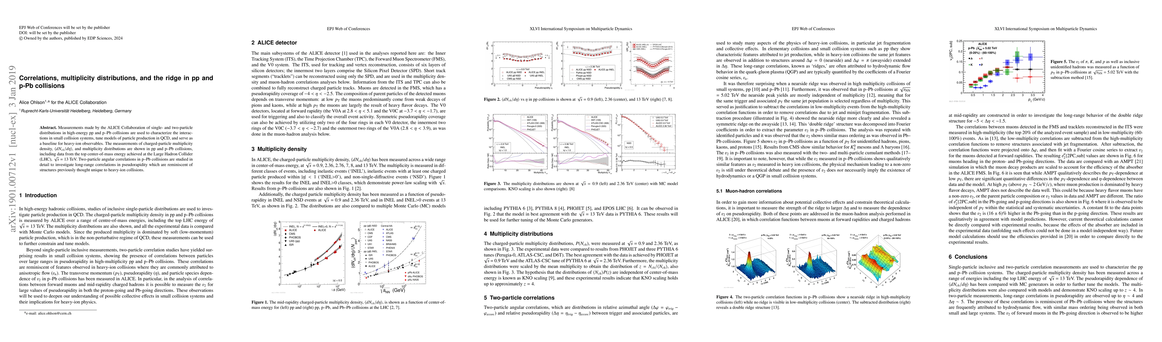Measurements made by the ALICE Collaboration of single- and two-particle distributions in high-energy pp and p-Pb collisions are used to characterize the interactions in small collision systems, tune models of particle production in QCD, and serve as a baseline for heavy-ion observables. The measurements of charged-particle multiplicity density, $\langle dN_{ch}/d\eta\rangle$, and multiplicity distributions are shown in pp and p-Pb collisions, including data from the top center-of-mass energy achieved at the Large Hadron Collider (LHC), $\sqrt{s}$ = 13 TeV. Two-particle angular correlations in p-Pb collisions are studied in detail to investigate long-range correlations in pseudorapidity which are reminiscent of structures previously thought unique to heavy-ion collisions.