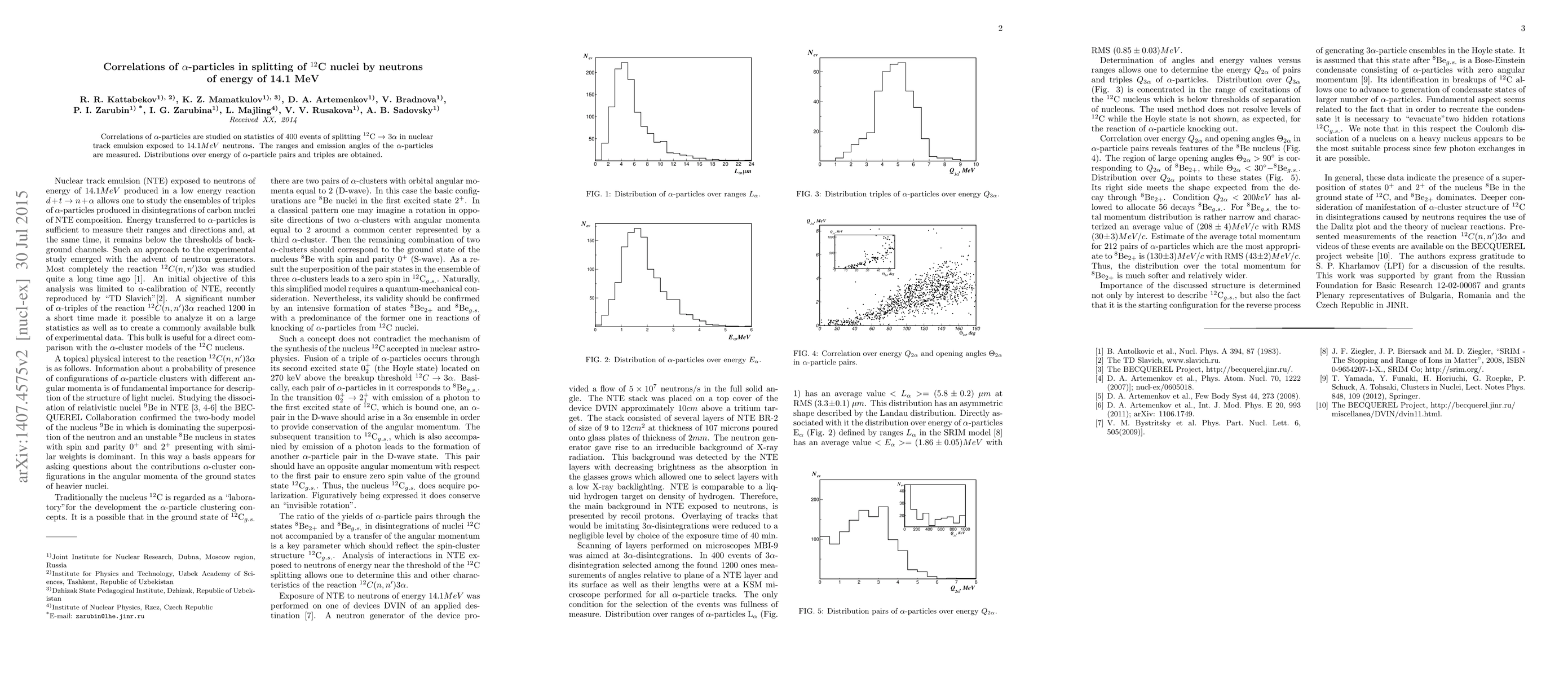 Researchers studied the correlations of alpha-particles resulting from the splitting of Carbon-12 nuclei by neutrons with an energy of 14.1 MeV, revealing distributions over alpha-particle pairs and triples.