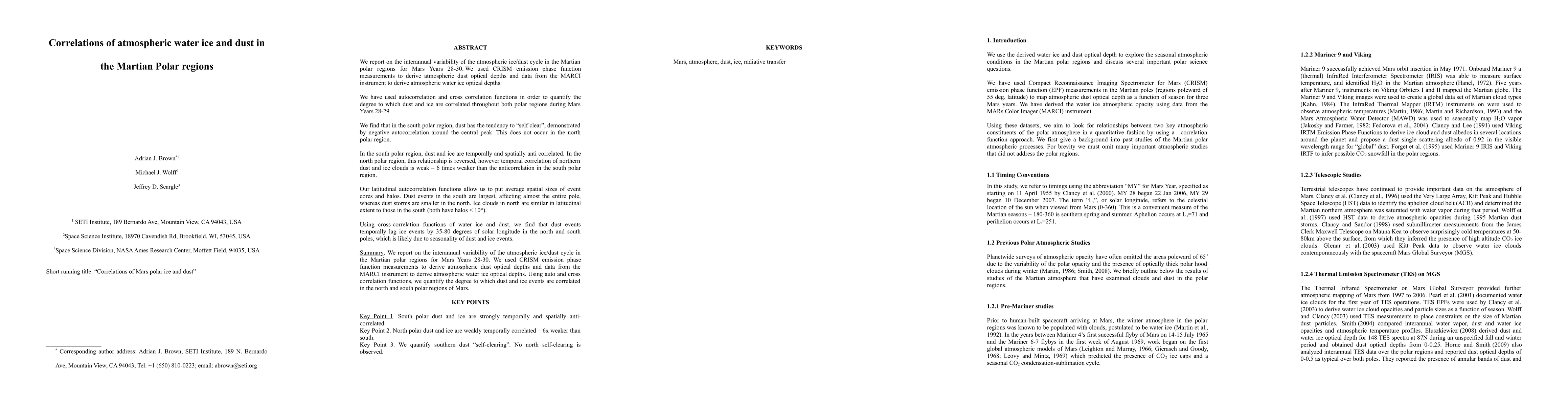 We report on the interannual variability of the atmospheric ice/dust cycle in the Martian polar regions for Mars Years 28-30. We used CRISM emission phase function measurements to derive atmospheric dust optical depths and data from the MARCI instrument to derive atmospheric water ice optical depths. We have used autocorrelation and cross correlation functions in order to quantify the degree to which dust and ice are correlated throughout both polar regions during Mars Years 28-29. We find that in the south polar region, dust has the tendency to "self clear", demonstrated by negative autocorrelation around the central peak. This does not occur in the north polar region. In the south polar region, dust and ice are temporally and spatially anti correlated. In the north polar region, this relationship is reversed, however temporal correlation of northern dust and ice clouds is weak - 6 times weaker than the anticorrelation in the south polar region. Our latitudinal autocorrelation functions allow us to put average spatial sizes of event cores and halos. Dust events in the south are largest, affecting almost the entire pole, whereas dust storms are smaller in the north. Ice clouds in north are similar in latitudinal extent to those in the south (both have halos < 10{\deg}). Using cross-correlation functions of water ice and dust, we find that dust events temporally lag ice events by 35-80 degrees of solar longitude in the north and south poles, which is likely due to seasonality of dust and ice events.