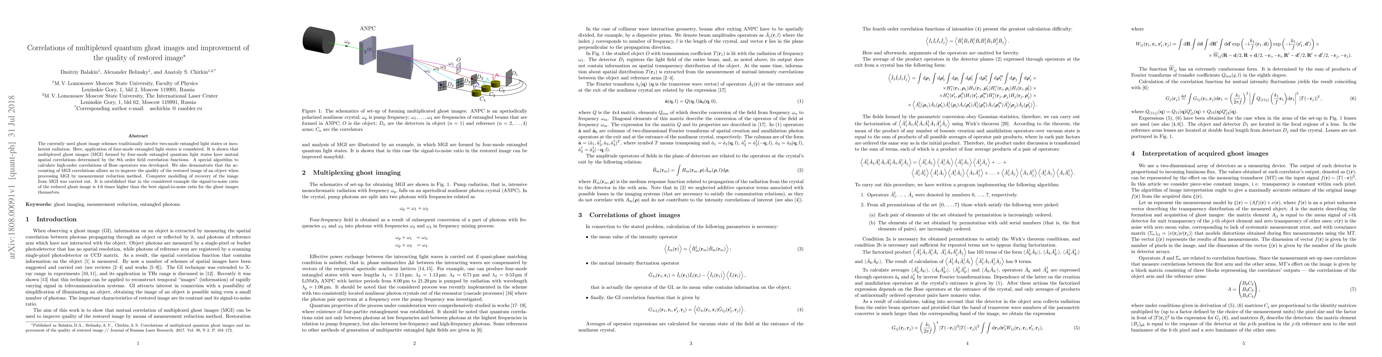 The currently used ghost image schemes traditionally involve two-mode entangled light states or incoherent radiation. Here, application of four-mode entangled light states is considered. It is shown that multiplexed ghost images (MGI) formed by four-mode entangled quantum light states have mutual spatial correlations determined by the 8th order field correlation functions. A special algorithm to calculate high-order correlations of Bose operators was developed. We also demonstrate that the accounting of MGI correlations allows us to improve the quality of the restored image of an object when processing MGI by measurement reduction method. Computer modelling of recovery of the image from MGI was carried out. It is established that in the considered example the signal-to-noise ratio of the reduced ghost image is $4.6$ times higher than the best signal-to-noise ratio for the ghost images themselves.