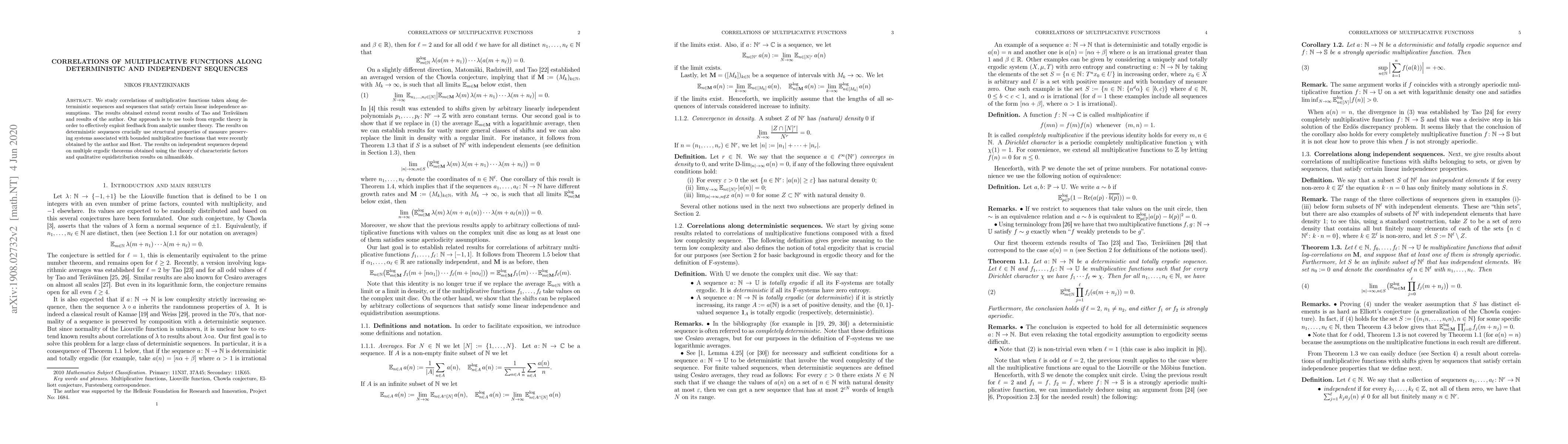 This paper investigates correlations of multiplicative functions along both deterministic and independent sequences, extending prior work by Tao, Teräväinen, and the author. It employs ergodic theory to bridge analytic number theory, utilizing structural properties of measure-preserving systems for deterministic sequences and multiple ergodic theorems for independent sequences.