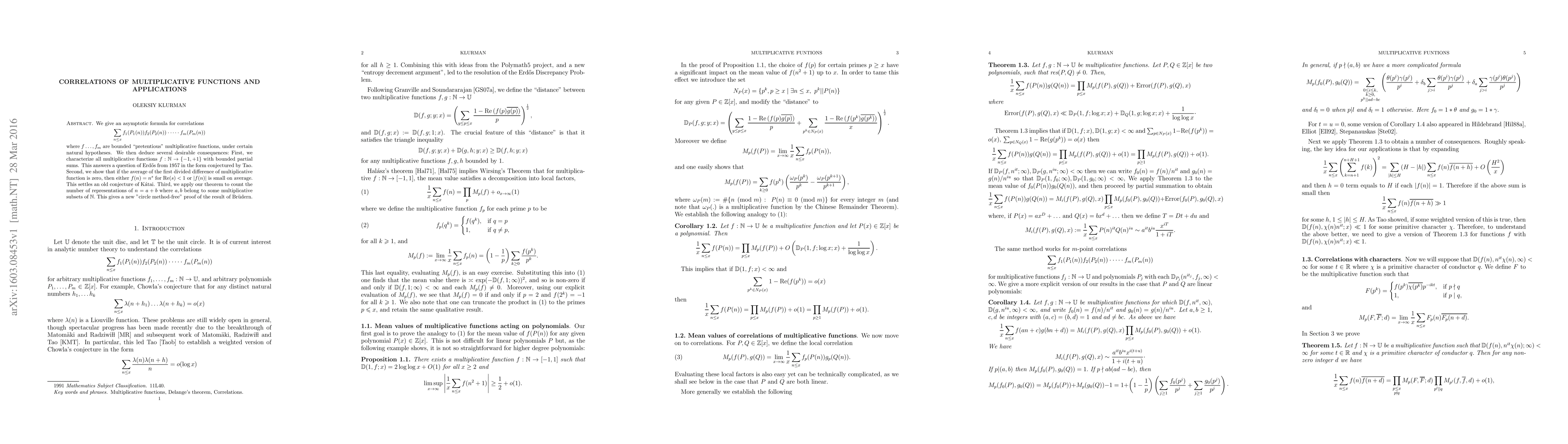 We give an asymptotic formula for correlations \[ \sum_{n\le x}f_1(P_1(n))f_2(P_2(n))\cdot \dots \cdot f_m(P_m(n))\] where $f\dots,f_m$ are bounded "pretentious" multiplicative functions, under certain natural hypotheses. We then deduce several desirable consequences:\ First, we characterize all multiplicative functions $f:\mathbb{N}\to\{-1,+1\}$ with bounded partial sums. This answers a question of Erd\H{o}s from $1957$ in the form conjectured by Tao. Second, we show that if the average of the first divided difference of multiplicative function is zero, then either $f(n)=n^s$ for $\operatorname{Re}(s)<1$ or $|f(n)|$ is small on average. This settles an old conjecture of K\'atai. Third, we apply our theorem to count the number of representations of $n=a+b$ where $a,b$ belong to some multiplicative subsets of $\mathbb{N}.$ This gives a new "circle method-free" proof of the result of Br\"udern.