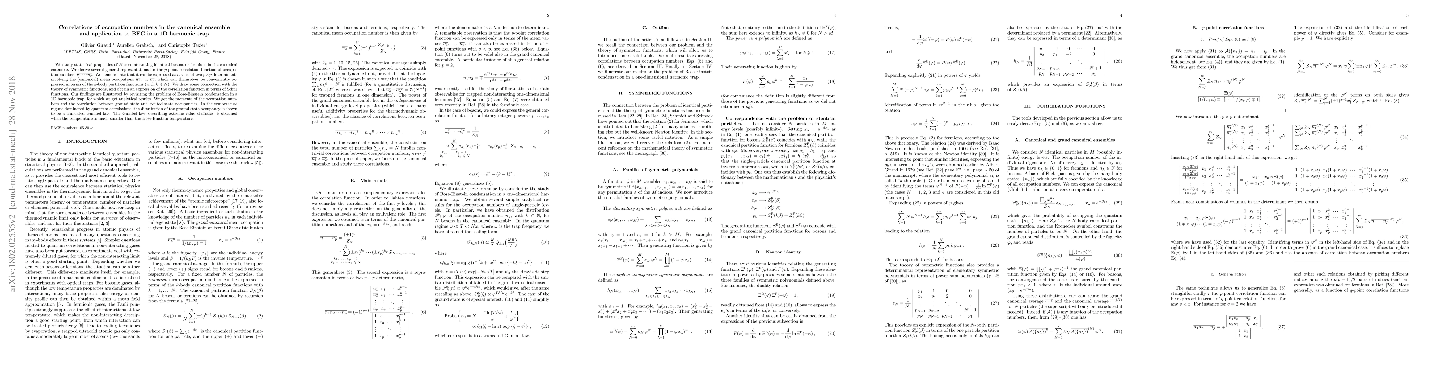 This paper derives general representations for the $p$-point correlation function in the canonical ensemble of non-interacting bosons or fermions, expressed as ratios of determinants involving mean occupations. It applies these findings to Bose-Einstein condensation in a 1D harmonic trap, revealing analytical results for occupation number moments and correlations, and demonstrating a truncated Gumbel law for the ground state occupancy at low temperatures.