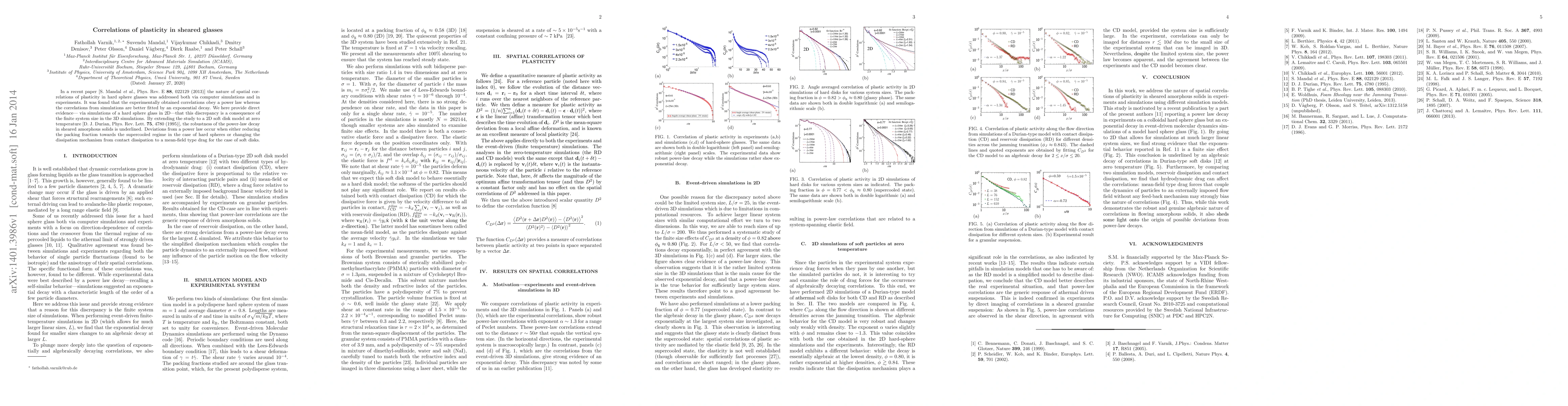 This paper investigates the spatial correlations of plasticity in sheared glasses using simulations and experiments, revealing that discrepancies arise due to finite system size effects in 3D simulations. It confirms the robustness of power-law decay in 2D soft disk models, highlighting deviations only under specific conditions like reduced packing fractions or altered dissipation mechanisms.