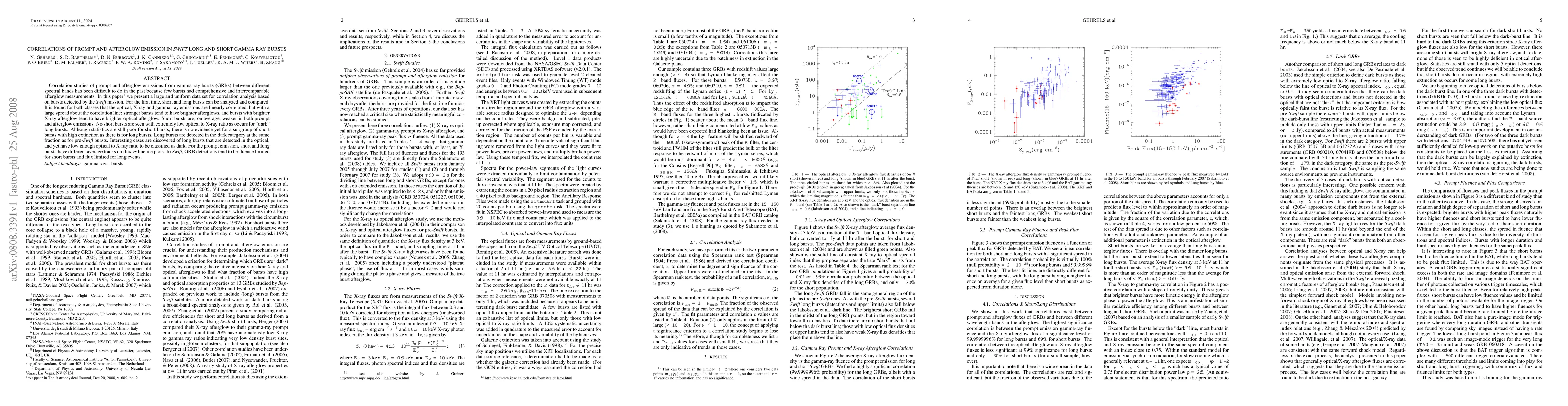 This paper analyzes correlations between prompt and afterglow emissions in long and short gamma-ray bursts (GRBs) using Swift mission data, revealing linear correlations across optical, X-ray, and gamma-ray bands with significant variability. Short bursts are generally weaker, with no evidence of "dark" bursts like some long bursts.