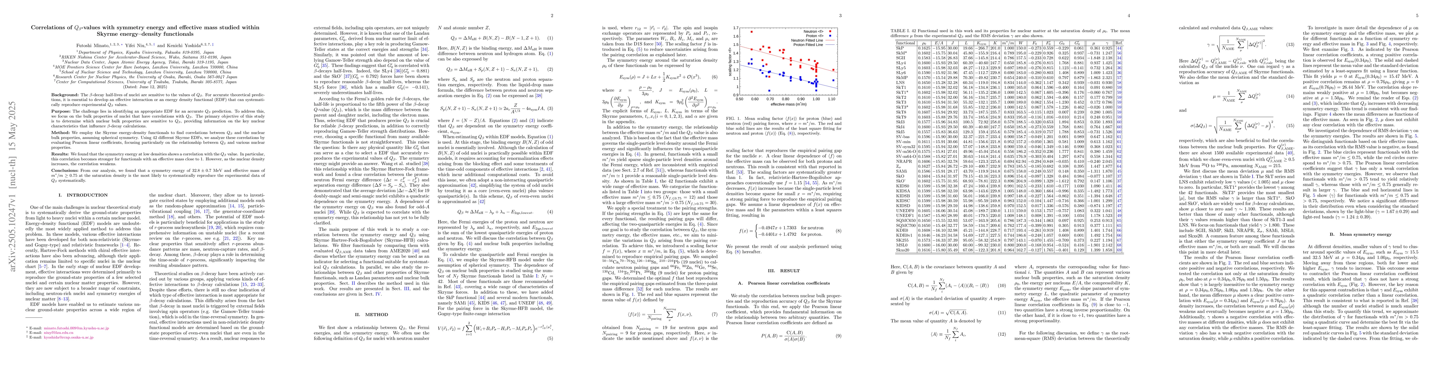 The paper presents a detailed analysis of correlations between $Q_{\beta}$ values and nuclear bulk properties, specifically symmetry energy and effective mass, using Skyrme EDFs.