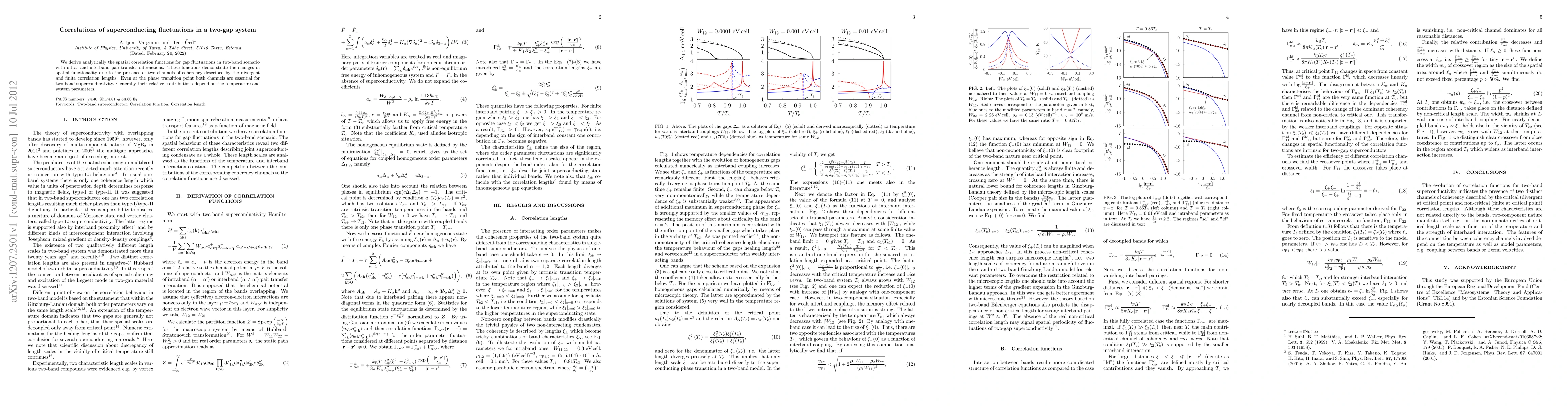 We derive analytically the spatial correlation functions for gap fluctuations in two-band scenario with intra- and interband pair-transfer interactions. These functions demonstrate the changes in spatial functionality due to the presence of two channels of coherency described by the divergent and finite correlation lengths. Even at the phase transition point both channels are essential for two-band superconductivity. Generally their relative contributions depend on the temperature and system parameters.