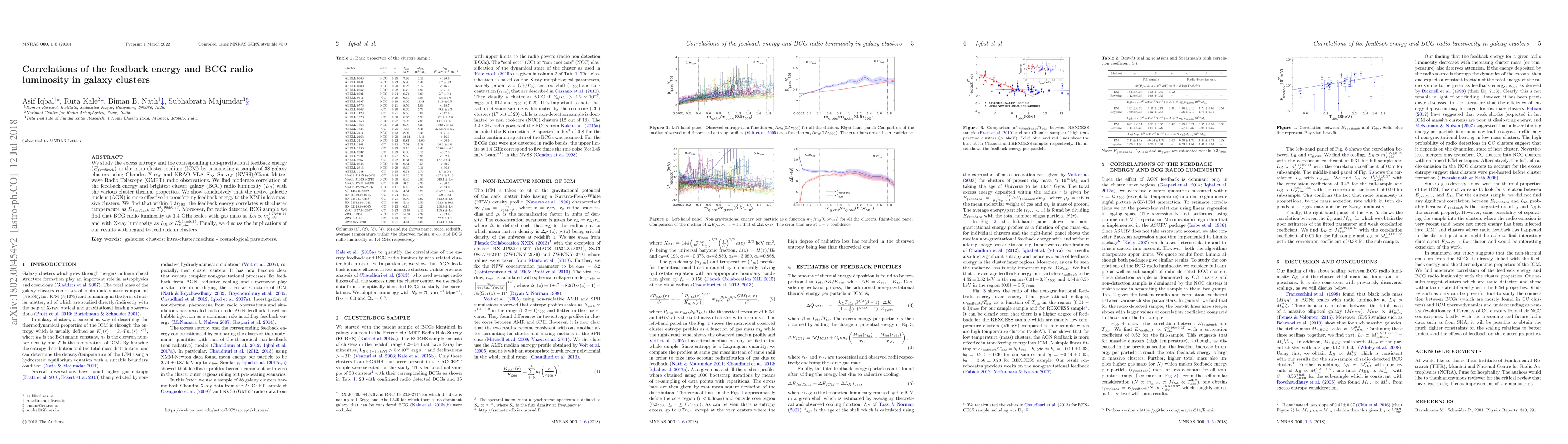 We study the excess entropy and the corresponding non-gravitational feedback energy ($E_{feedback}$) in the intra-cluster medium (ICM) by considering a sample of 38 galaxy clusters using Chandra X-ray and NRAO VLA Sky Survey (NVSS)/Giant Metrewave Radio Telescope (GMRT) radio observations. We find moderate correlation of the feedback energy and brightest cluster galaxy (BCG) radio luminosity ($L_R$) with the various cluster thermal properties. We show conclusively that the active galactic nucleus (AGN) is more effective in transferring feedback energy to the ICM in less massive clusters. We find that within $0.3r_{500}$, the feedback energy correlates with cluster temperature as $E_{feedback}\propto T_{obs}^{0.98\pm0.37}$. Moreover, for radio detected BCG sample we find that BCG radio luminosity at 1.4 GHz scales with gas mass as $L_R\propto m_{g,obs}^{ 1.76\pm0.71}$ and with X-ray luminosity as $L_R\propto L_{X,obs}^{0.94\pm0.35}$. Finally, we discuss the implications of our results with regard to feedback in clusters.