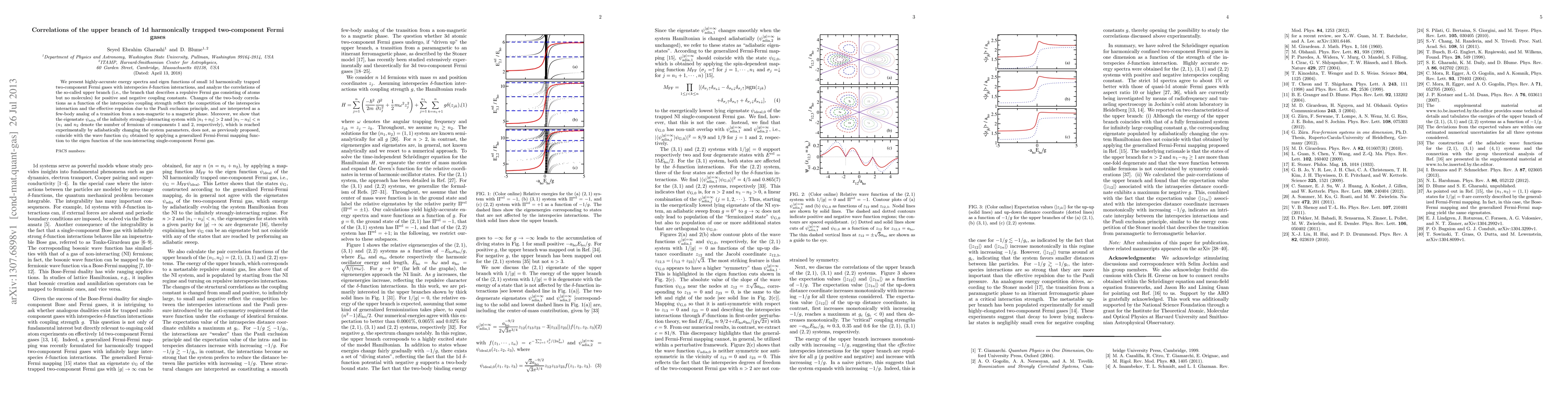 We present highly-accurate energy spectra and eigen functions of small 1d harmonically trapped two-component Fermi gases with interspecies $\delta$-function interactions, and analyze the correlations of the so-called upper branch (i.e., the branch that describes a repulsive Fermi gas consisting of atoms but no molecules) for positive and negative coupling constants. Changes of the two-body correlations as a function of the interspecies coupling strength reflect the competition of the interspecies interaction and the effective repulsion due to the Pauli exclusion principle, and are interpreted as a few-body analog of a transition from a non-magnetic to a magnetic phase. Moreover, we show that the eigenstate $\psi_{\rm{adia}}$ of the infinitely strongly-interacting system with $|n_1+n_2|>2$ and $|n_1-n_2| < n$ ($n_1$ and $n_2$ denote the number of fermions of components 1 and 2, respectively), which is reached experimentally by adiabatically changing the system parameters, does not, as previously proposed, coincide with the wave function $\psi_{\rm{G}}$ obtained by applying a generalized Fermi-Fermi mapping function to the eigen function of the non-interacting single-component Fermi gas.