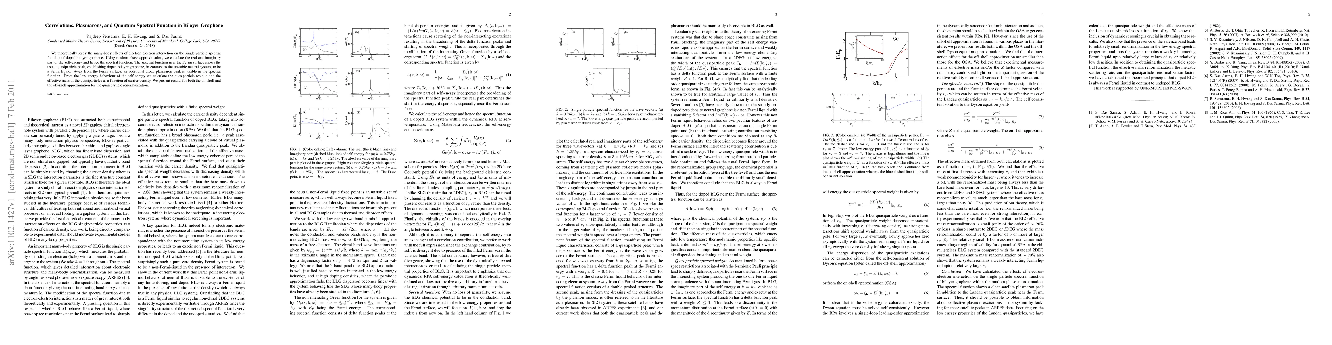 This paper investigates the many-body effects of electron-electron interactions in doped bilayer graphene, revealing a quasiparticle peak near the Fermi surface indicative of a Fermi liquid state. An additional broad plasmaron peak is observed away from the Fermi surface, and the study calculates the quasiparticle residue and effective mass as functions of carrier density.