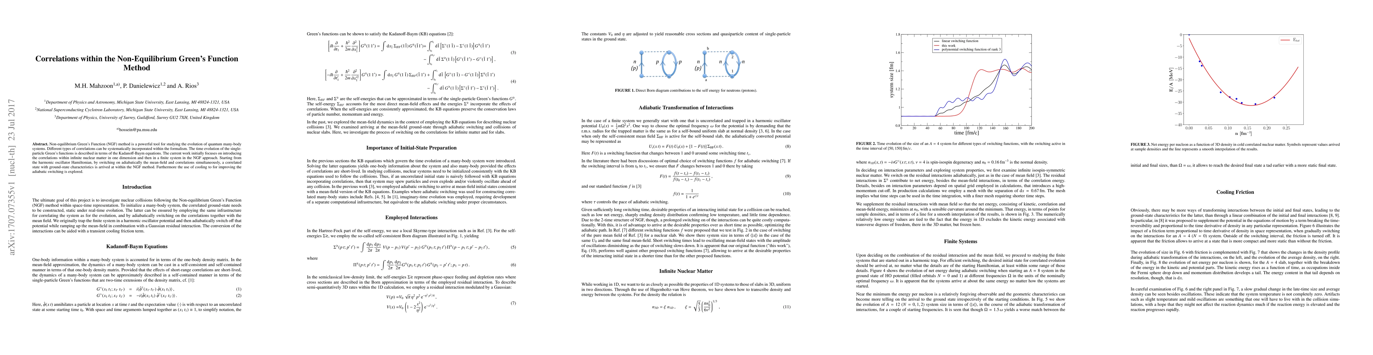 This paper explores the incorporation of various correlations within the Non-equilibrium Green's Function (NGF) method to study the evolution of quantum many-body systems. It demonstrates the method's application in both infinite nuclear matter and finite systems, achieving a correlated state with ground-state characteristics by adiabatically switching on mean-field and correlations, and investigates cooling techniques to enhance the adiabatic switching process.