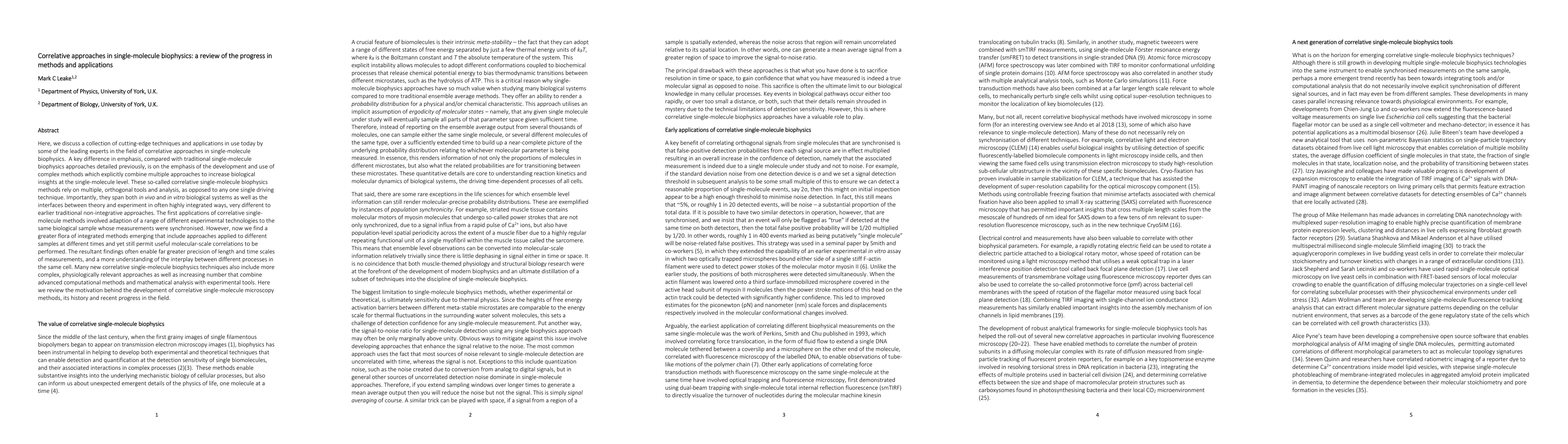 Here, we discuss a collection of cutting-edge techniques and applications in use today by some of the leading experts in the field of correlative approaches in single-molecule biophysics. A key difference in emphasis, compared with traditional single-molecule biophysics approaches detailed previously, is on the emphasis of the development and use of complex methods which explicitly combine multiple approaches to increase biological insights at the single-molecule level. These so-called correlative single-molecule biophysics methods rely on multiple, orthogonal tools and analysis, as opposed to any one single driving technique. Importantly, they span both in vivo and in vitro biological systems as well as the interfaces between theory and experiment in often highly integrated ways, very different to earlier traditional non-integrative approaches. The first applications of correlative single-molecule methods involved adaption of a range of different experimental technologies to the same biological sample whose measurements were synchronised. However, now we find a greater flora of integrated methods emerging that include approaches applied to different samples at different times and yet still permit useful molecular-scale correlations to be performed. The resultant findings often enable far greater precision of length and time scales of measurements, and a more understanding of the interplay between different processes in the same cell. Many new correlative single-molecule biophysics techniques also include more complex, physiologically relevant approaches as well as increasing number that combine advanced computational methods and mathematical analysis with experimental tools. Here we review the motivation behind the development of correlative single-molecule microscopy methods, its history and recent progress in the field.