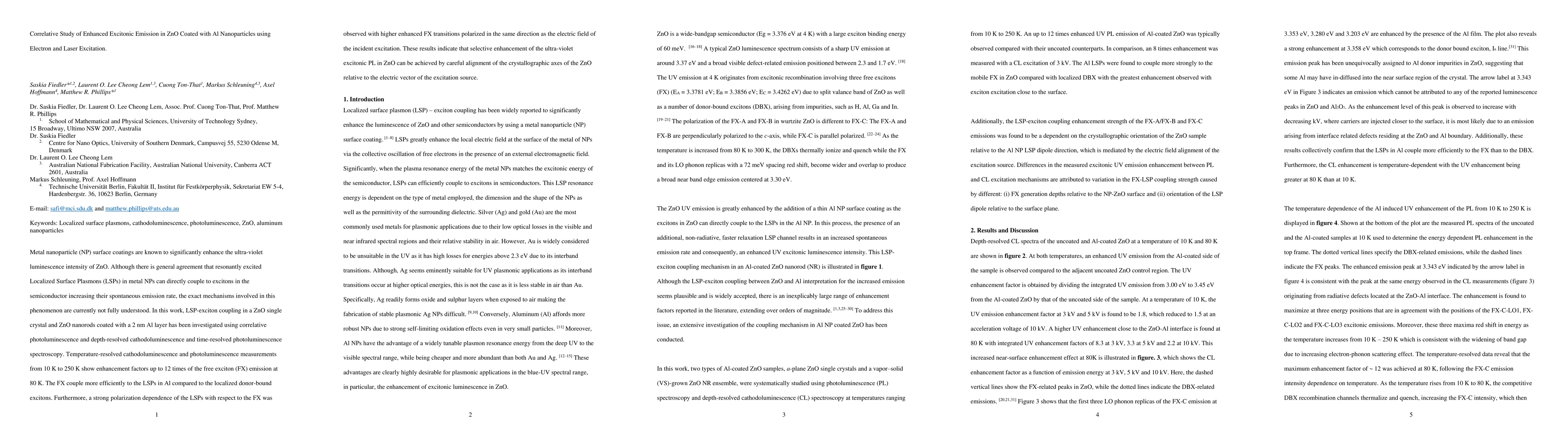 Metal nanoparticle (NP) surface coatings are known to significantly enhance the ultra-violet luminescence intensity of ZnO. Although there is general agreement that resonantly excited Localized Surface Plasmons (LSPs) in metal NPs can directly couple to excitons in the semiconductor increasing their spontaneous emission rate, the exact mechanisms involved in this phenomenon are currently not fully understood. In this work, LSP-exciton coupling in a ZnO single crystal and ZnO nanorods coated with a 2 nm Al layer has been investigated using correlative photoluminescence and depth-resolved cathodoluminescence and time-resolved photoluminescence spectroscopy. Temperature-resolved cathodoluminescence and photoluminescence measurements from 10 K to 250 K show enhancement factors up to 12 times of the free exciton (FX) emission at 80 K. The FX couple more efficiently to the LSPs in Al compared to the localized donor-bound excitons. Furthermore, a strong polarization dependence of the LSPs with respect to the FX was observed with higher enhanced FX transitions polarized in the same direction as the electric field of the incident excitation. These results indicate that selective enhancement of the ultra-violet excitonic PL in ZnO can be achieved by careful alignment of the crystallographic axes of the ZnO relative to the electric vector of the excitation source.