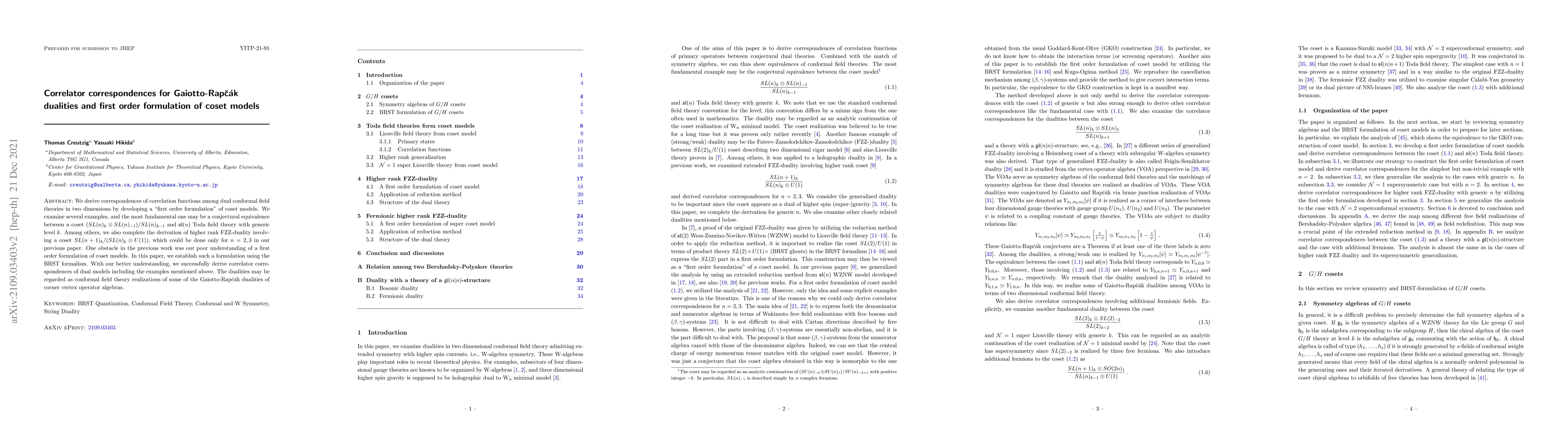 We derive correspondences of correlation functions among dual conformal field theories in two dimensions by developing a "first order formulation" of coset models. We examine several examples, and the most fundamental one may be a conjectural equivalence between a coset $(SL(n)_k \otimes SL(n)_{-1})/SL(n)_{k-1}$ and $\mathfrak{sl}(n)$ Toda field theory with generic level $k$. Among others, we also complete the derivation of higher rank FZZ-duality involving a coset $SL(n+1)_k /(SL(n)_{k} \otimes U(1))$, which could be done only for $n=2,3$ in our previous paper. One obstacle in the previous work was our poor understanding of a first order formulation of coset models. In this paper, we establish such a formulation using the BRST formalism. With our better understanding, we successfully derive correlator correspondences of dual models including the examples mentioned above. The dualities may be regarded as conformal field theory realizations of some of the Gaiotto-Rap\v{c}\'ak dualities of corner vertex operator algebras.