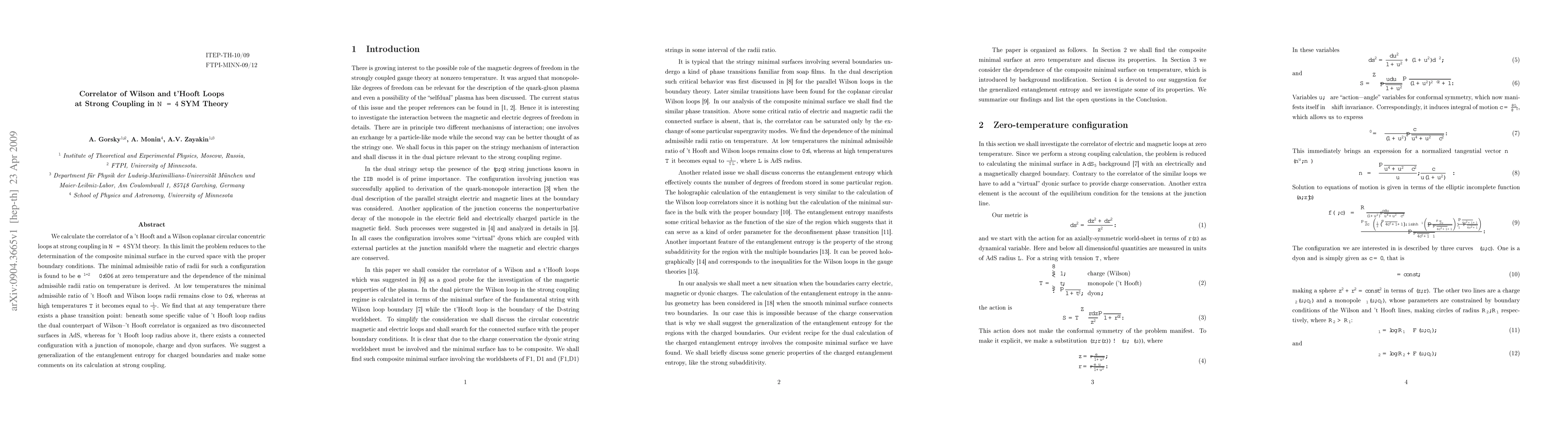 We calculate the correlator of a 't Hooft and a Wilson coplanar circular concentric loops at strong coupling in N=4 SYM theory when it reduces to the calculation of the composite minimal surface in the curved space with the proper boundary conditions. The minimal admissible ratio of the radii of 't Hooft and Wilson loops for such a configuration is found to be $\mathrm{e}^{-1/2}\approx 0.606$ at zero temperature and the dependence of the minimal admissible radii ratio on temperature is derived. At low temperatures the minimal admissible ratio for 't Hooft and Wilson loops remains close to 0.6, whereas at high temperatures $T$ it becomes equal to $\frac{1}{\pi T}$. We find that at any temperature there exists a phase transition point: beneath some specific value of 't Hooft loop radius the dual counterpart of Wilson-'t Hooft correlator is organized as two disconnected surfaces in AdS, whereas for 't Hooft loop radius above it, there exists a connected configuration with a junction of monopole, charge and dyon surfaces. We suggest a generalization of the entanglement entropy for charged boundaries and make some comments on its calculation at strong coupling.