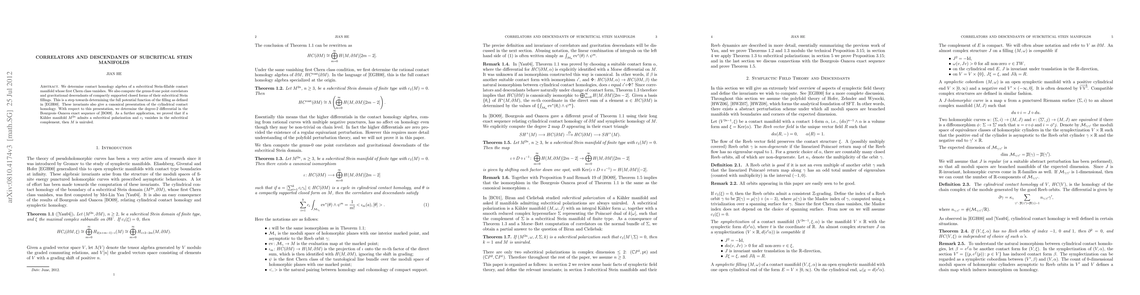 We determine contact homology algebra of a subcritical Stein-fillable contact manifold whose first Chern class vanishes. We also compute the genus-0 one point correlators and gravitational descendants of compactly supported closed forms of their subcritical Stein fillings. This is a step towards determining the full potential function of the filling as defined in \cite{EliashbergGiventalHofer}. These invariants also give a canonical presentation of the cylindrical contact homology. With respect to this presentation, we determine the degree-2 differential in the Bourgeois--Oancea exact sequence of \cite{Oancea}. As a further application, we proved that if a K\"{a}hler manifold $M^{2n}$ admits a subcritical polarization and $c_1$ vanishes in the subcritical complement, then $M$ is uniruled.