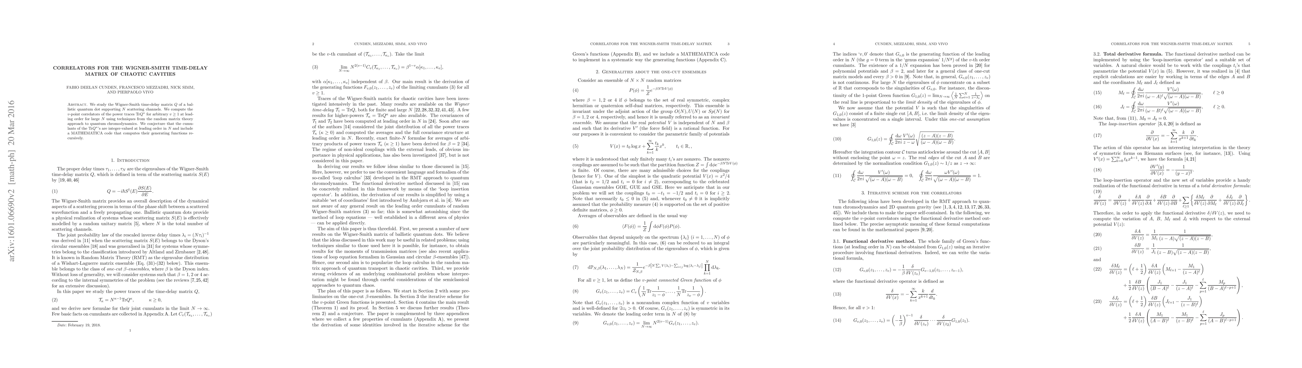 This paper investigates the Wigner-Smith time-delay matrix $Q$ for a ballistic quantum dot with $N$ channels, computing $v$-point correlators of the power traces $\mathrm{Tr} Q^{\kappa}$ at large $N$. It conjectures that the cumulants of these traces are integer-valued at leading order and provides a MATHEMATICA code for their recursive computation.