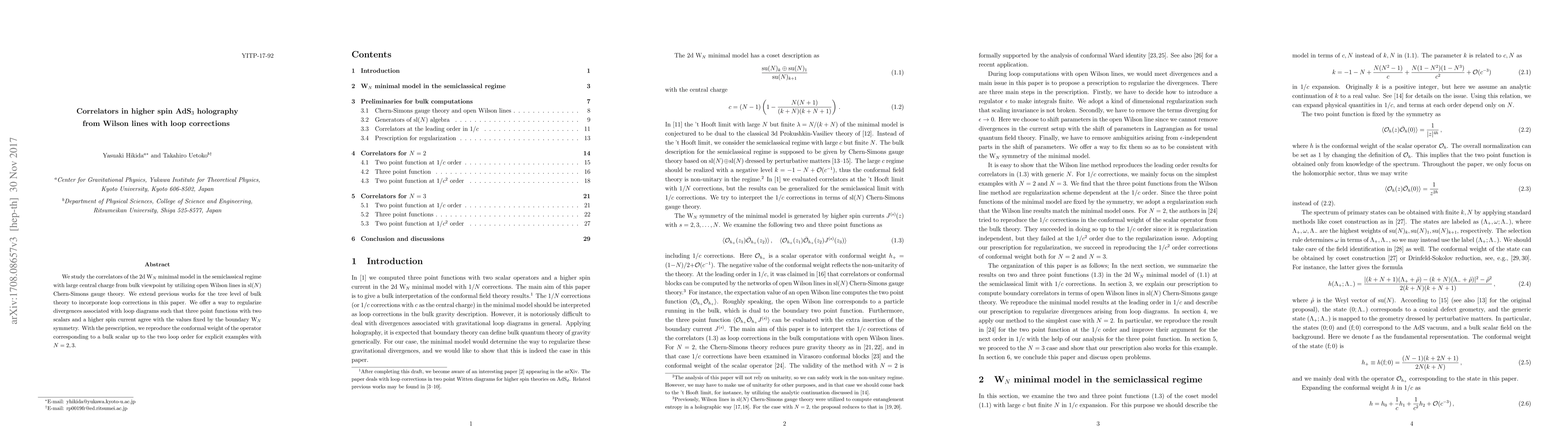 We study the correlators of the 2d W_N minimal model in the semiclassical regime with large central charge from bulk viewpoint by utilizing open Wilson lines in sl(N) Chern-Simons gauge theory. We extend previous works for the tree level of bulk theory to incorporate loop corrections in this paper. We offer a way to regularize divergences associated with loop diagrams such that three point functions with two scalars and a higher spin current agree with the values fixed by the boundary W_N symmetry. With the prescription, we reproduce the conformal weight of the operator corresponding to a bulk scalar up to the two loop order for explicit examples with N=2,3.