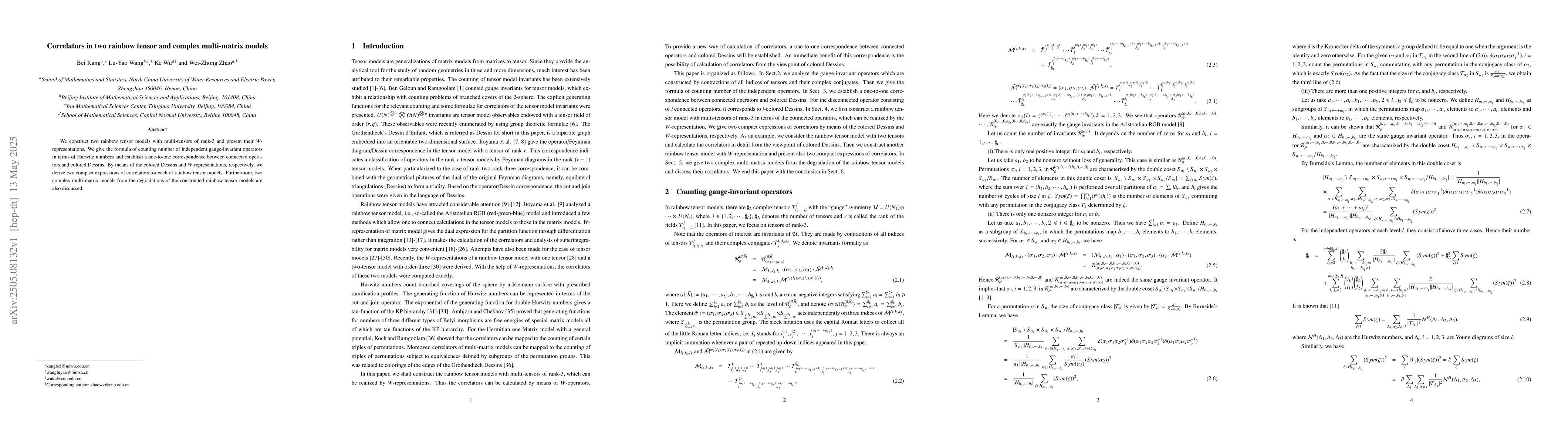 The paper constructs two rainbow tensor models with multi-tensors of rank-3 and presents their W-representations, deriving compact expressions for correlators using colored Dessins and W-representations.