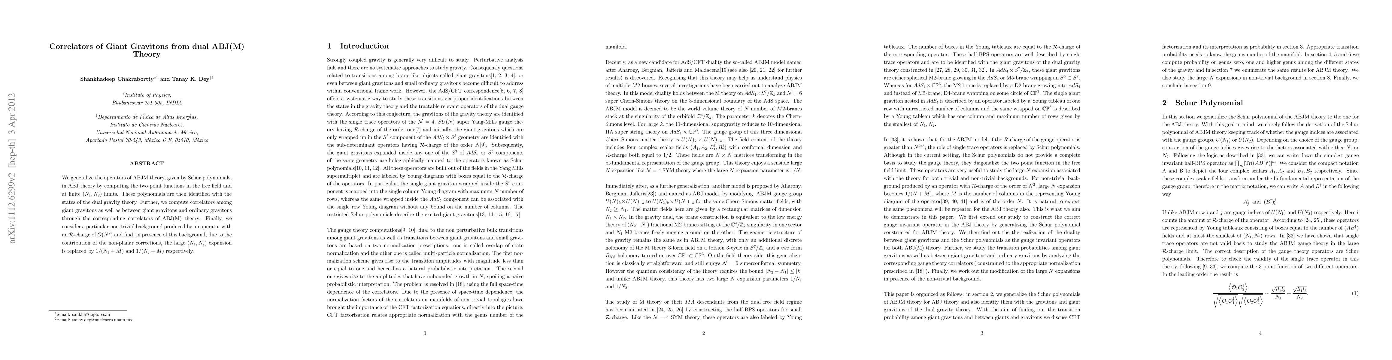 We generalize the operators of ABJM theory, given by Schur polynomials, in ABJ theory by computing the two point functions in the free field and at finite $(N_1,N_2)$ limits. These polynomials are then identified with the states of the dual gravity theory. Further, we compute correlators among giant gravitons as well as between giant gravitons and ordinary gravitons through the corresponding correlators of ABJ(M) theory. Finally, we consider a particular non-trivial background produced by an operator with an $\cal R$-charge of $O(N^2)$ and find, in presence of this background, due to the contribution of the non-planar corrections, the large $(N_1,N_2)$ expansion is replaced by $1/(N_1+M)$ and $1/(N_2+M)$ respectively.