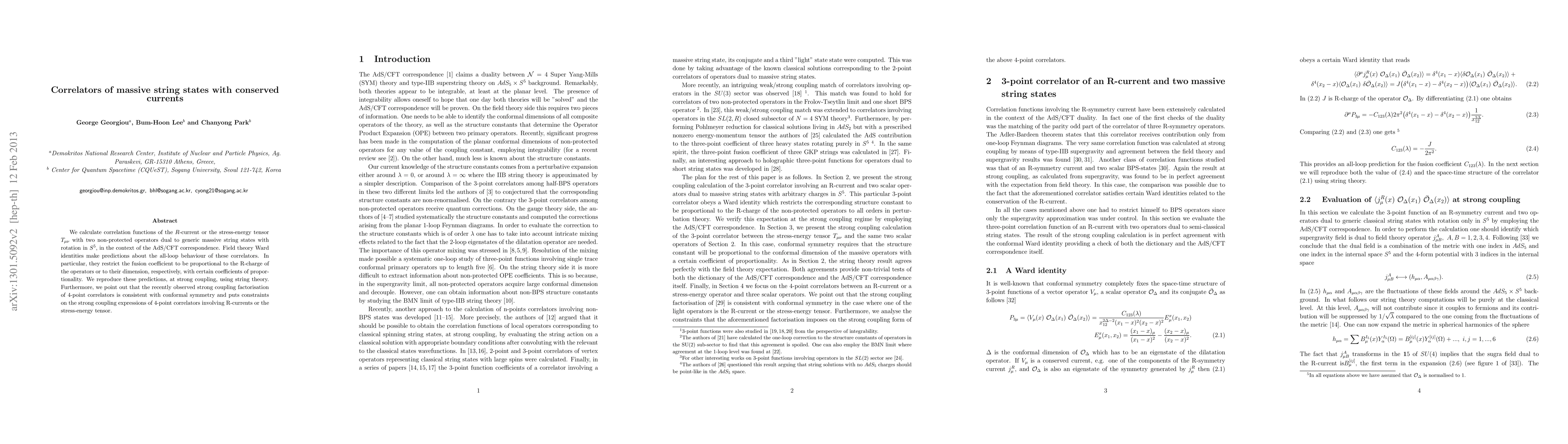 We calculate correlation functions of the R-current or the stress-energy tensor T_{\mu\nu} with two non-protected operators dual to generic massive string states with rotation in S^5, in the context of the AdS/CFT correspondence. Field theory Ward identities make predictions about the all-loop behaviour of these correlators. In particular, they restrict the fusion coefficient to be proportional to the R-charge of the operators or to their dimension, respectively, with certain coefficients of proportionality. We reproduce these predictions, at strong coupling, using string theory. Furthermore, we point out that the recently observed strong coupling factorisation of 4-point correlators is consistent with conformal symmetry and puts constraints on the strong coupling expressions of 4-point correlators involving R-currents or the stress-energy tensor.