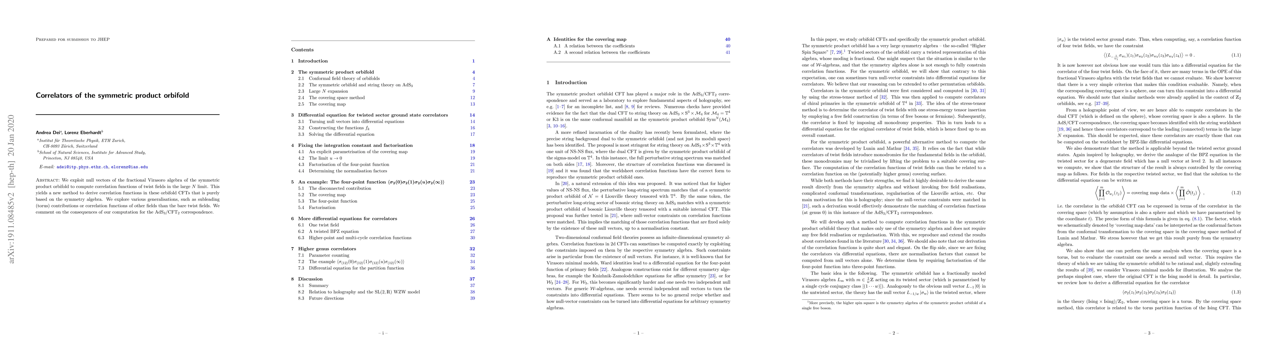 This paper develops a novel method to compute correlation functions in symmetric product orbifold conformal field theories (CFTs) using null vectors of the fractional Virasoro algebra, providing insights into the AdS₃/CFT₂ correspondence. The approach focuses on large N limits and explores subleading contributions and other field types.