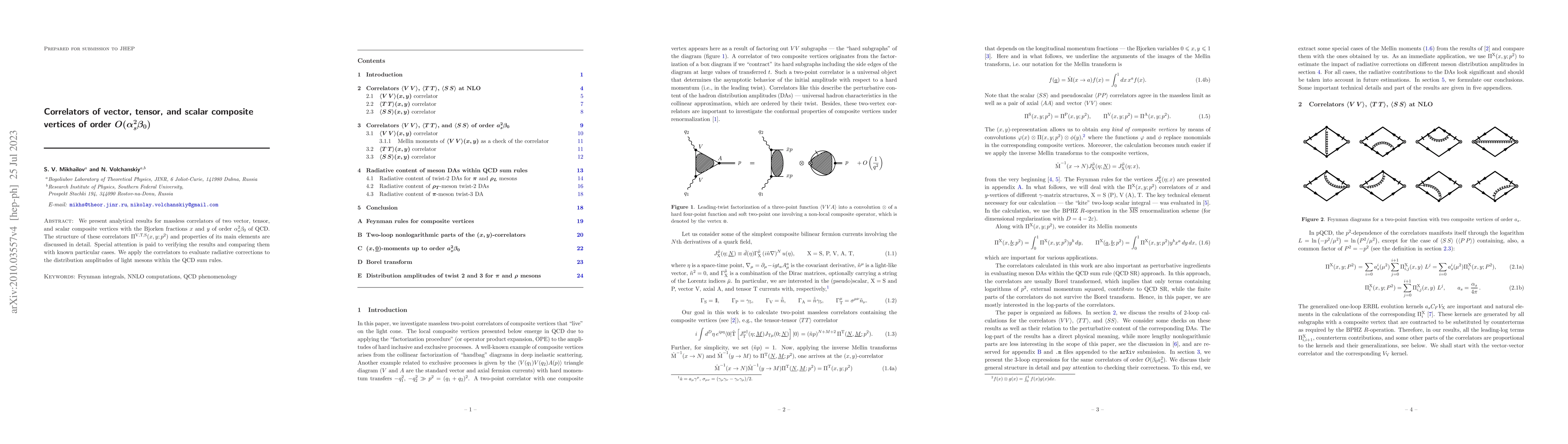 This paper provides analytical results for the correlators of vector, tensor, and scalar composite vertices at the order $\alpha_s^2 \beta_0$ in QCD, discussing their structure and properties. The findings are applied to evaluate radiative corrections to the distribution amplitudes of light mesons using QCD sum rules.