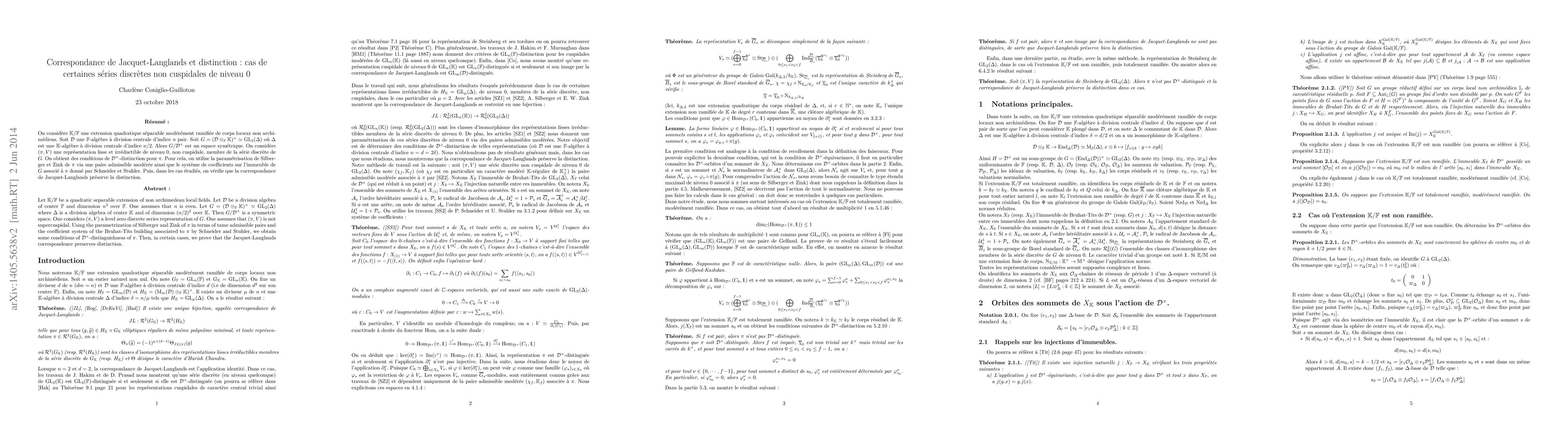 Let K/F be a quadratic extension of non archimedean local fields. Let V be an irreducible level zero discrete series representation of the group G = GL2(R), where R is a division algebra of center K and of index r. One assumes that V is not a supercuspidal representation. Let D be a division algebra of center F and index 2r. In the following work, we try to answer this question : Is the representation V D^{*}-distinguished if and only if its image by the Jacquet-Langlands correspondence is GL2(F)-distinguished. To answer this question, we use the coefficients system on the Bruhat-Tits building of G associated to the representation V by P. Schneider and U. Stuhler and the parametrization of level zero discrete series representation given by J. Silberger and E. W. Zink.