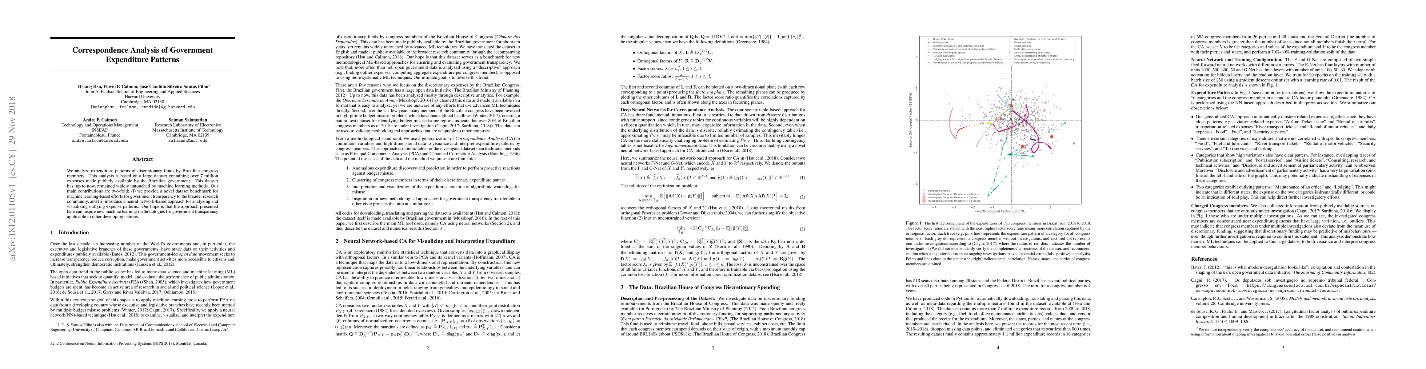 We analyze expenditure patterns of discretionary funds by Brazilian congress members. This analysis is based on a large dataset containing over $7$ million expenses made publicly available by the Brazilian government. This dataset has, up to now, remained widely untouched by machine learning methods. Our main contributions are two-fold: (i) we provide a novel dataset benchmark for machine learning-based efforts for government transparency to the broader research community, and (ii) introduce a neural network-based approach for analyzing and visualizing outlying expense patterns. Our hope is that the approach presented here can inspire new machine learning methodologies for government transparency applicable to other developing nations.