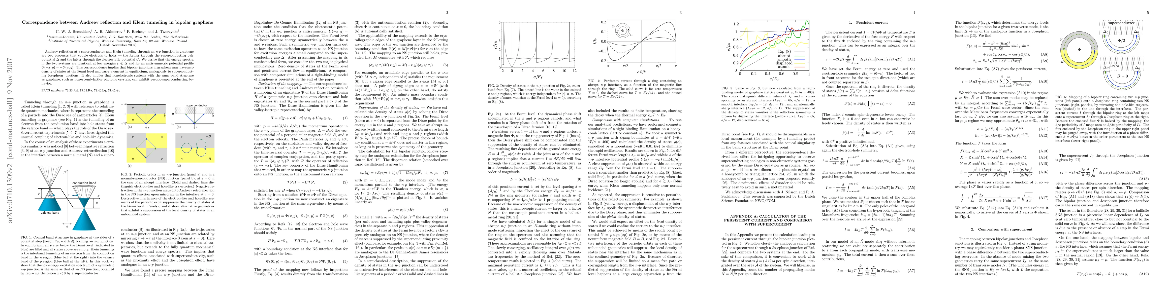 Summary: This paper demonstrates a correspondence between Andreev reflection in superconductors and Klein tunneling in graphene, showing identical low-energy spectra. It implies that bipolar graphene junctions can behave like superconducting Josephson junctions and suggests that materials with similar band structures, like photonic crystals, may exhibit pseudo-superconducting properties.