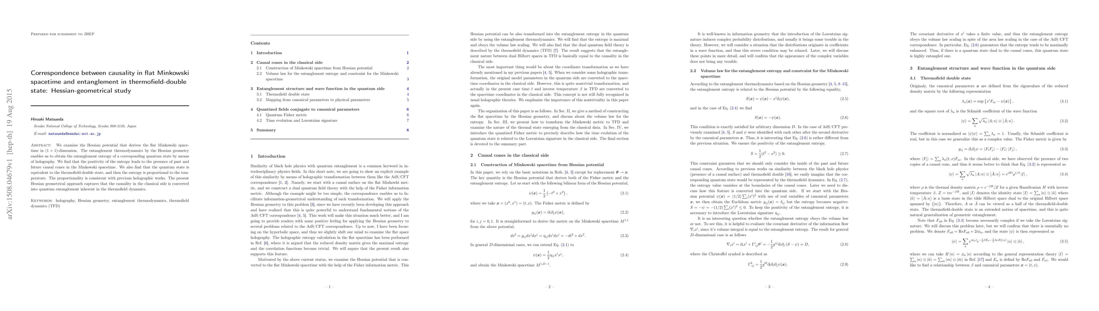 We examine the Hessian potential that derives the flat Minkowski spacetime in $(1+1)$-dimension. The entanglement thermodynamics by the Hessian geometry enables us to obtain the entanglement entropy of a corresponding quantum state by means of holography. We find that the positivity of the entropy leads to the presence of past and future causal cones in the Minkowski spacetime. We also find that the quantum state is equivalent to the thermofield-double state, and then the entropy is proportional to the temperature. The proportionality is consistent with previous holographic works. The present Hessian geometrical approach captures that the causality in the classical side is converted into quantum entanglement inherent in the thermofield dynamics.