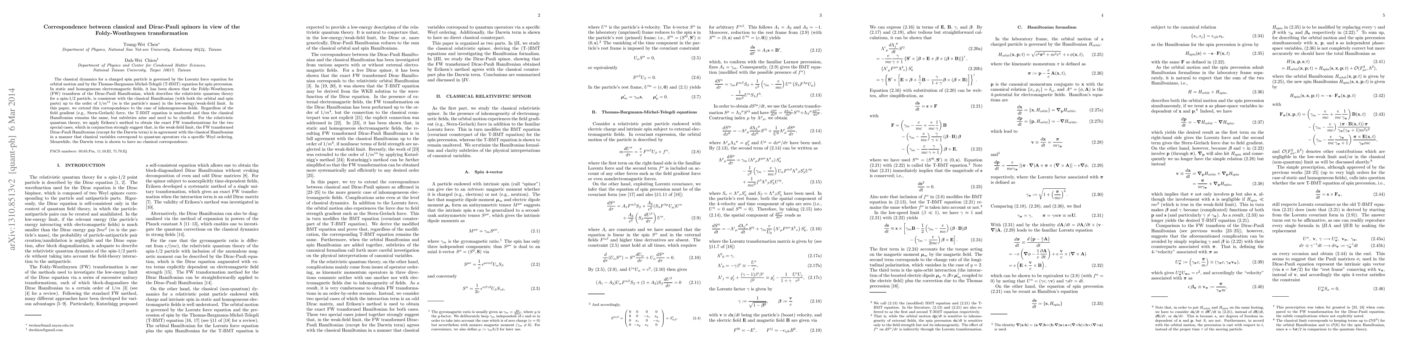 The classical dynamics for a charged spin particle is governed by the Lorentz force equation for orbital motion and by the Thomas-Bargmann-Michel-Telegdi (T-BMT) equation for spin precession. In static and homogeneous electromagnetic fields, it has been shown that the Foldy-Wouthuysen (FW) transform of the Dirac-Pauli Hamiltonian, which describes the relativistic quantum theory for a spin-1/2 particle, is consistent with the classical Hamiltonian (with both the orbital and spin parts) up to the order of $1/m^{14}$ ($m$ is the particle's mass) in the low-energy/weak-field limit. In this paper, we extend this correspondence to the case of inhomogeneous fields. Regardless of the field gradient (e.g., Stern-Gerlach) force, the T-BMT equation is unaltered and thus the classical Hamiltonian remains the same, but subtleties arise and need to be clarified. For the relativistic quantum theory, we apply Eriksen's method to obtain the exact FW transformations for the two special cases, which in conjunction strongly suggest that, in the weak-field limit, the FW transformed Dirac-Pauli Hamiltonian (except for the Darwin term) is in agreement with the classical Hamiltonian in a manner that classical variables correspond to quantum operators via a specific Weyl ordering. Meanwhile, the Darwin term is shown to have no classical correspondence.