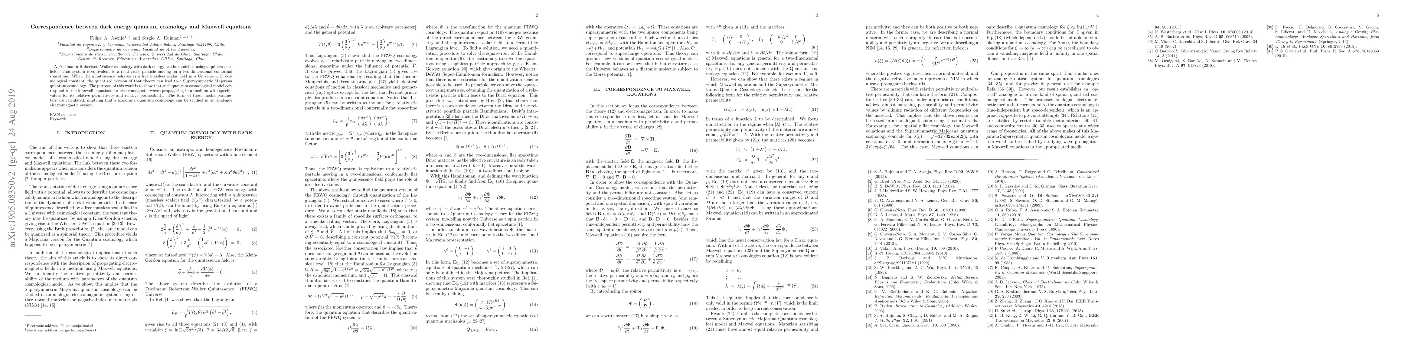 This paper demonstrates that a Friedmann-Robertson-Walker cosmology with dark energy, modeled using a quintessence field, corresponds to the Maxwell equations for electromagnetic waves. The study finds that a supersymmetric Majorana quantum cosmology can be analogized to an electromagnetic medium with specific permittivity and permeability values.