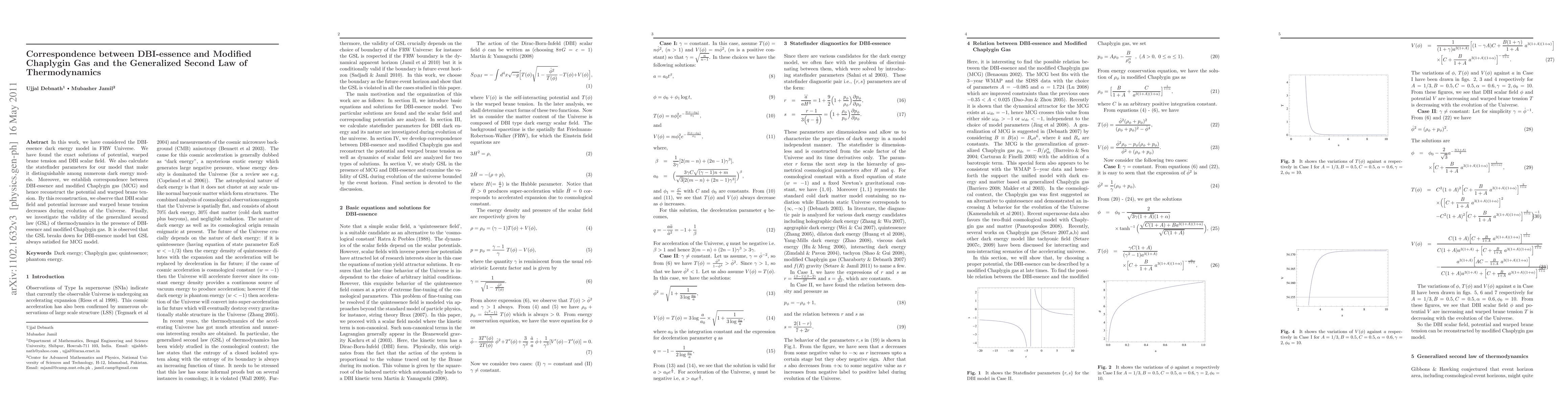 This paper explores the DBI-essence dark energy model in a FRW universe, deriving exact solutions and calculating statefinder parameters. It establishes a correspondence between DBI-essence and modified Chaplygin gas, noting changes in DBI scalar field and potential. The study finds that while the generalized second law of thermodynamics holds for the modified Chaplygin gas model, it fails for the DBI-essence model.