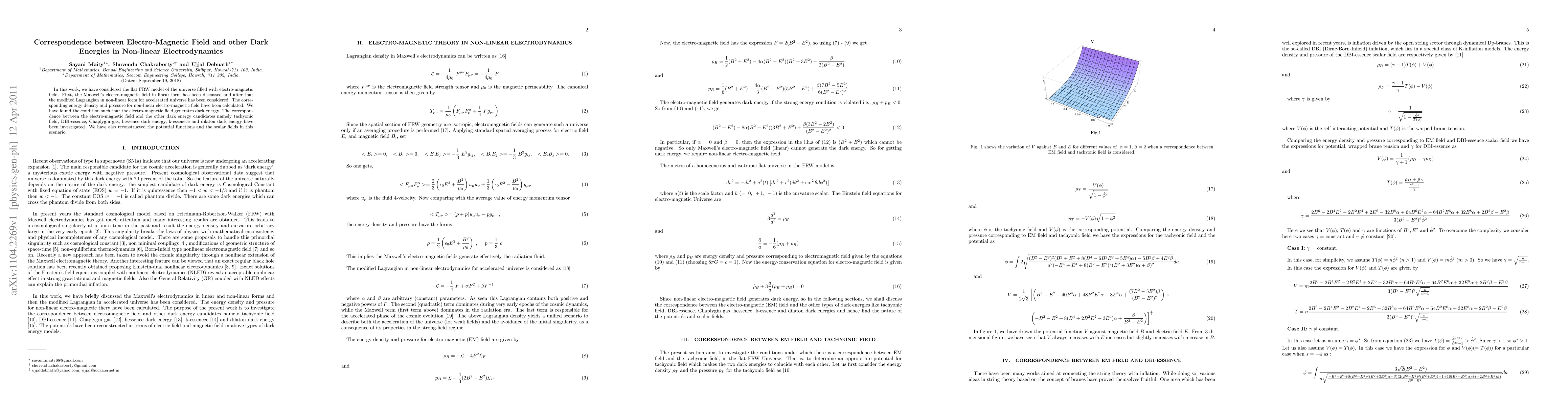 This paper explores the flat FRW model universe with a non-linear electro-magnetic field, calculating its energy density and pressure. It investigates how the electro-magnetic field can generate dark energy and compares it with other dark energy candidates, reconstructing potential functions and scalar fields in the process.