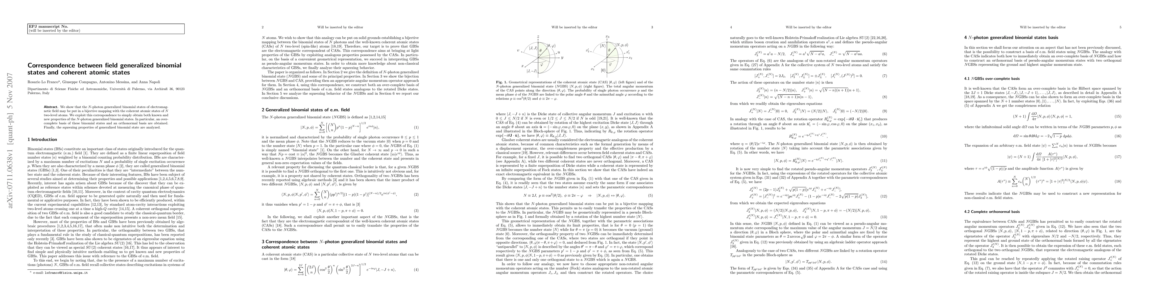 This paper establishes a bijective mapping between $N$-photon generalized binomial states in electromagnetic fields and coherent atomic states of $N$ two-level atoms, revealing new properties and bases for the former, and analyzing their squeezing properties.