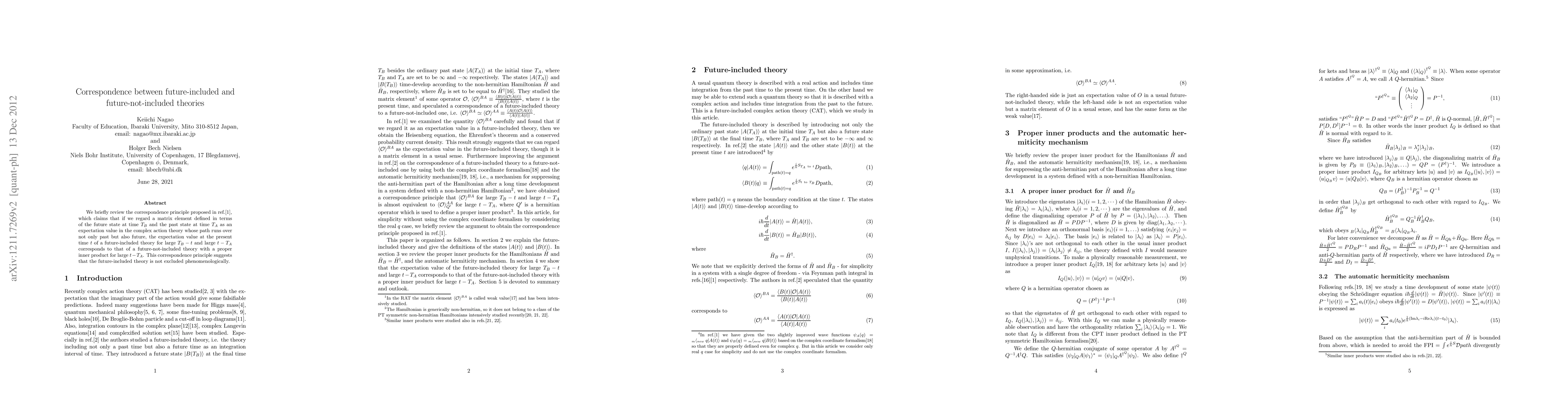 We briefly review the correspondence principle proposed in our previous paper, which claims that if we regard a matrix element defined in terms of the future state at time $T_B$ and the past state at time $T_A$ as an expectation value in the complex action theory whose path runs over not only past but also future, the expectation value at the present time $t$ of a future-included theory for large $T_B-t$ and large $t-T_A$ corresponds to that of a future-not-included theory with a proper inner product for large $t-T_A$. This correspondence principle suggests that the future-included theory is not excluded phenomenologically.