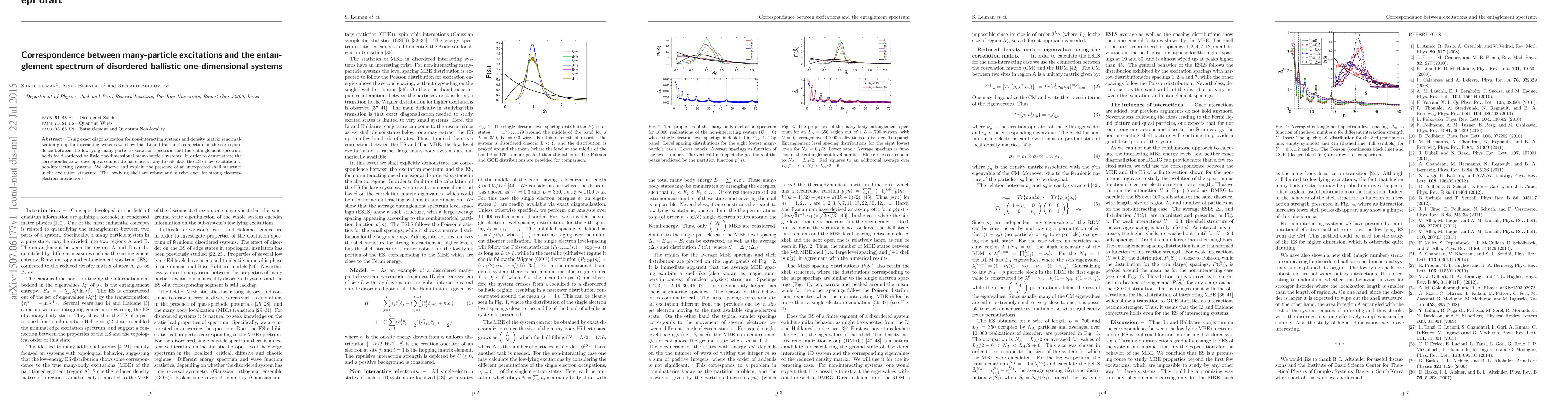This paper confirms Li and Haldane's conjecture on the correspondence between the low-lying many-particle excitations and the entanglement spectrum in disordered ballistic one-dimensional systems. It develops efficient computational methods to verify this correspondence, revealing a robust shell structure in the excitation spectrum that persists even under strong electron-electron interactions.